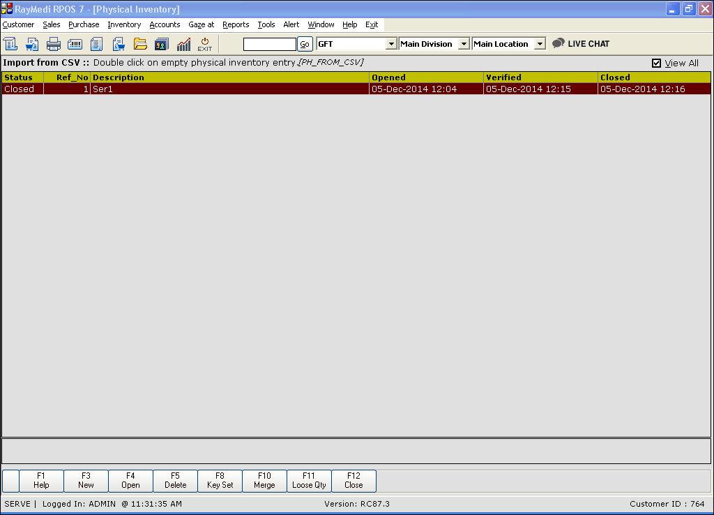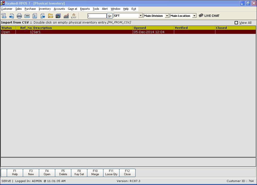 1. Click Inventory >> Physical Inventory. The Physical inventory screen is displayed.