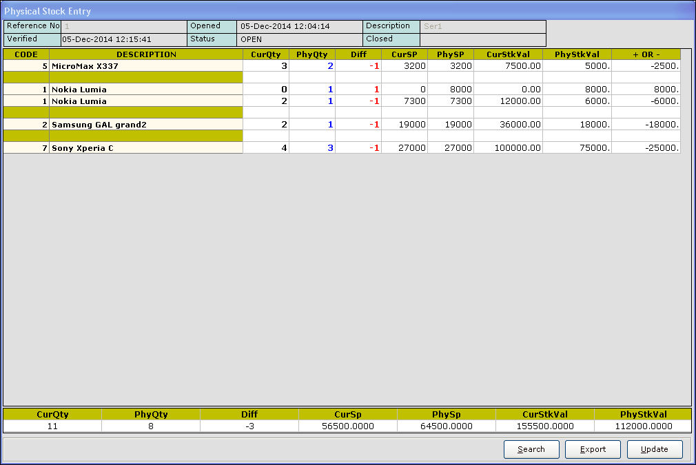 15. Click Verify. The difference between the current quantity (available in system) and physical quantity (available in hand) is displayed in the Diff column.