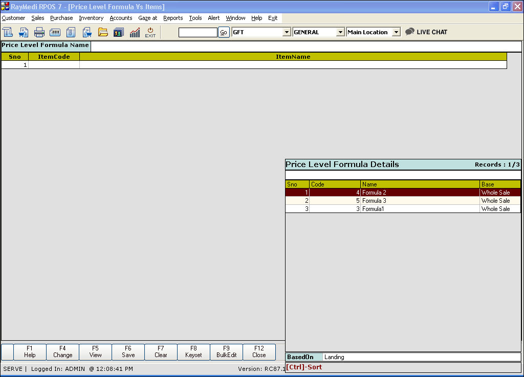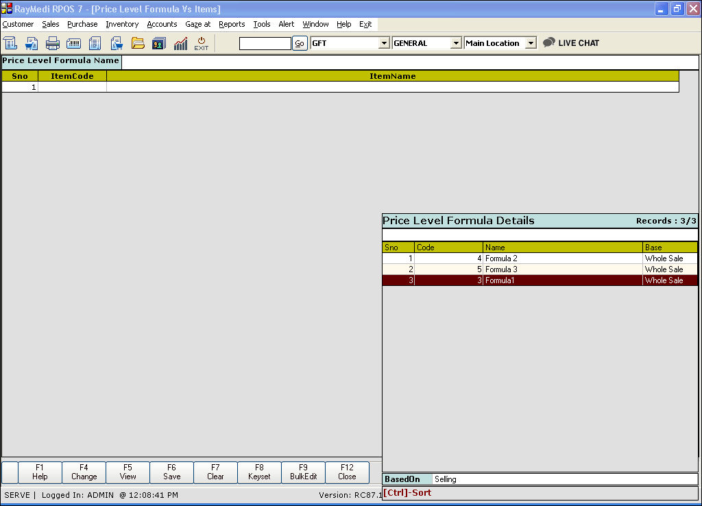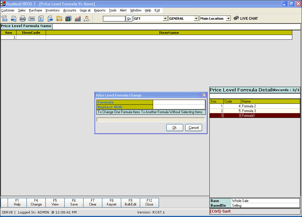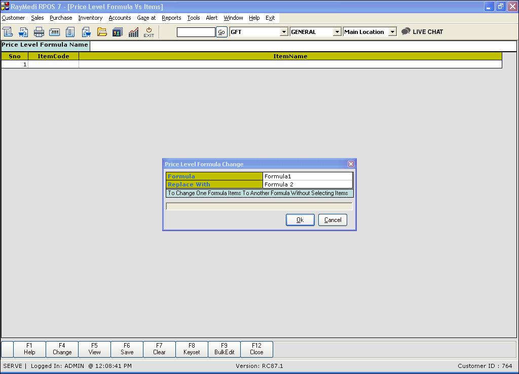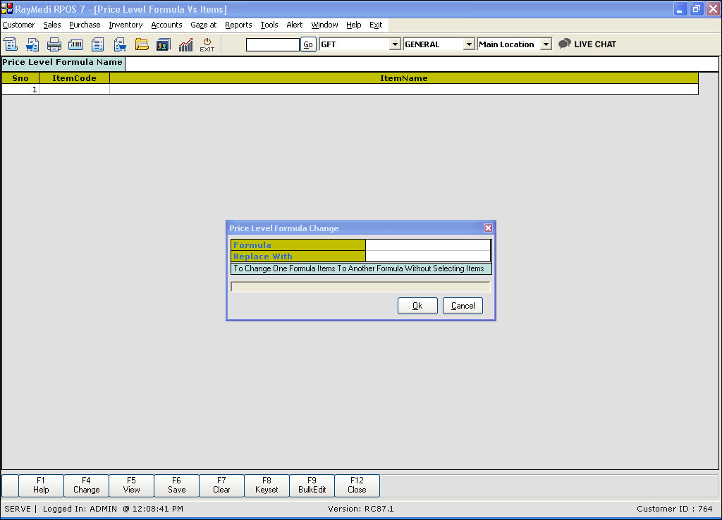 1. Click F9 [Bulk Edit] key. The Price Level Formula Change screen is displayed.