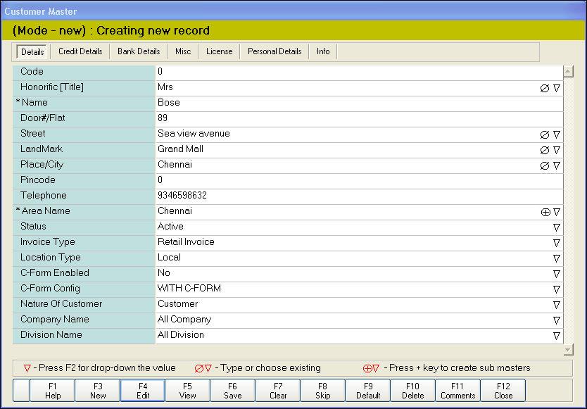 1. Click Customer >> Master >> Customer Master. The Customer Master screen is displayed.