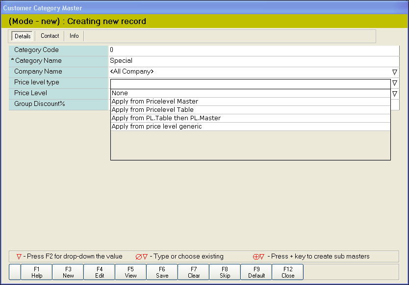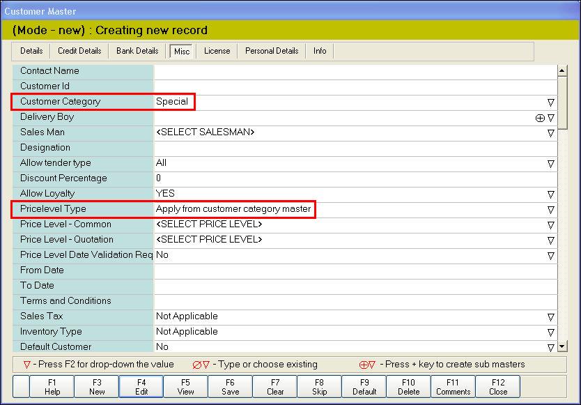 5. In the Price Level Type field, select option Apply from Customer Category Master.