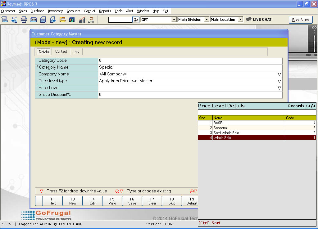 For the above customer, the customer category is mapped with Special and the price level type 'Apply from customer category master' is also mapped. The price level type selected in the customer category master is Wholesale.