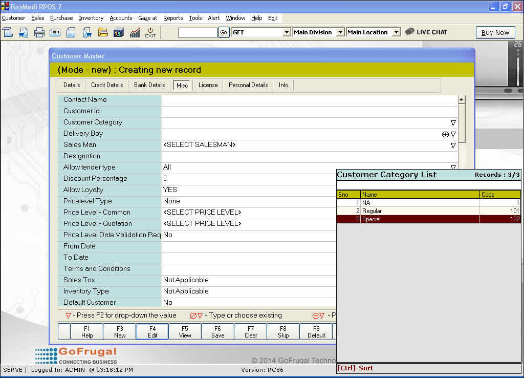 1. Click Customer >> Master >> Customer Category Master. The Customer Category Master screen is displayed.
