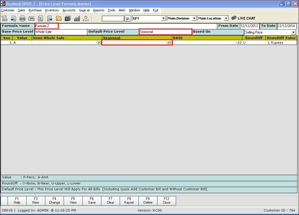 With Price level formula screen, you can configure the price levels with different values for a certain time period. Also, you can set default price levels. The disadvantage of price level formula is that you need to map the formula to each item separately in the Item Master. But, with Price level formula vs items, you can map any number of items to a single formula in the same screen. By doing so, the formula is applied to all the items. In the billing screen, when you load that items, the default price levels are automatically applied. In case, you want to change the price level, you can do so by invoking SHIFT + F2 key.