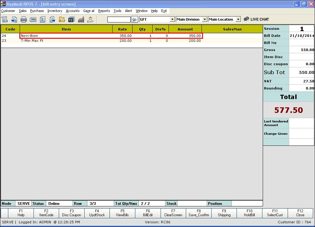 After mapping, the default price level [Seasonal -20 in Amount] is automatically applied in the billing screen and the selling price of the item is reduced from 350 to 330. This is shown in the below image.