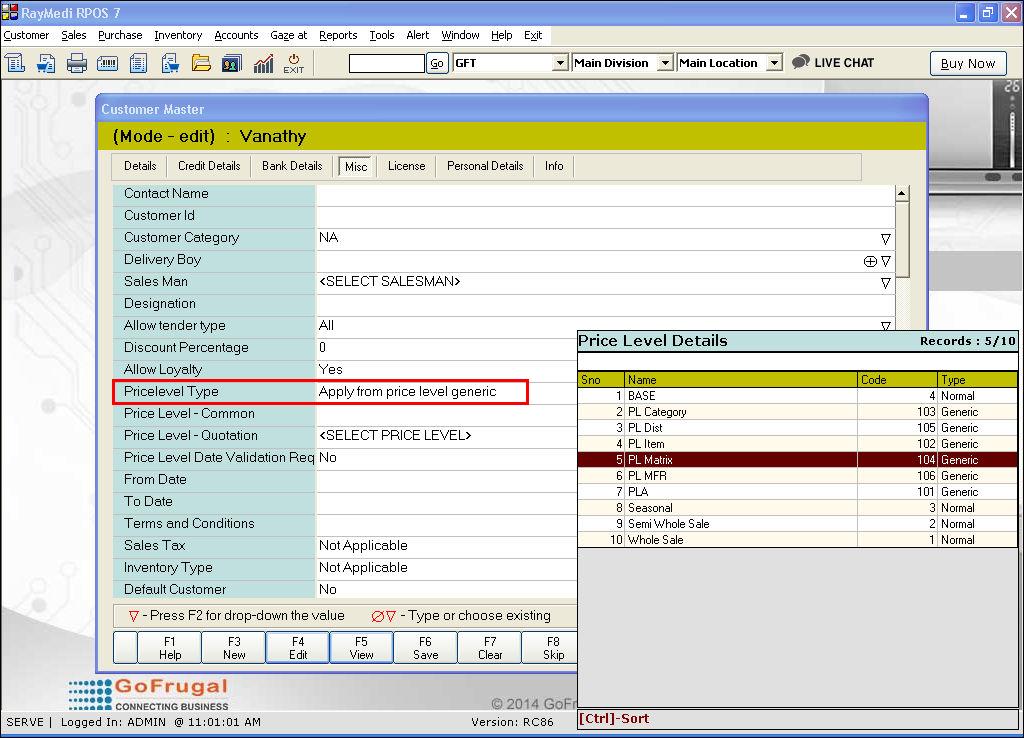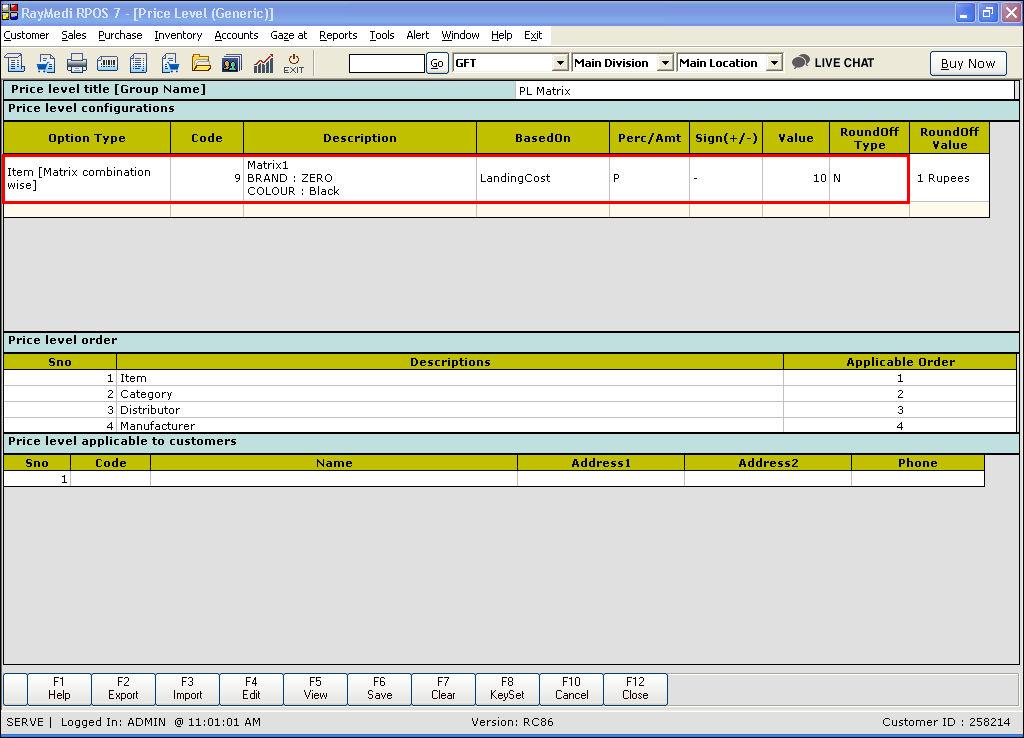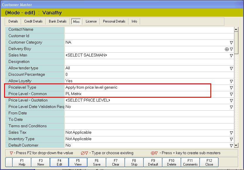 All the Price levels created using Price Level Master, Price Level Vs Items, Price Level (Generic) can be mapped with the customer name so that the price levels are automatically applied upon selecting the customer name in the billing screen.
