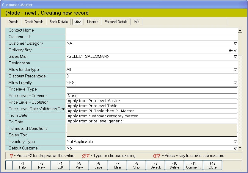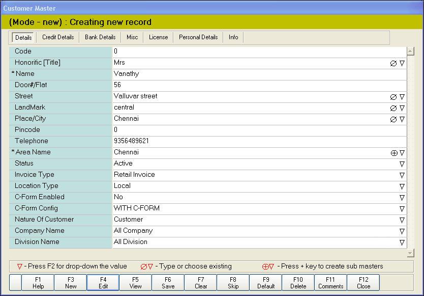 1. Click Customer >> Master >> Customer Master (CTRL + SHIFT + C). The Customer Master screen is displayed.