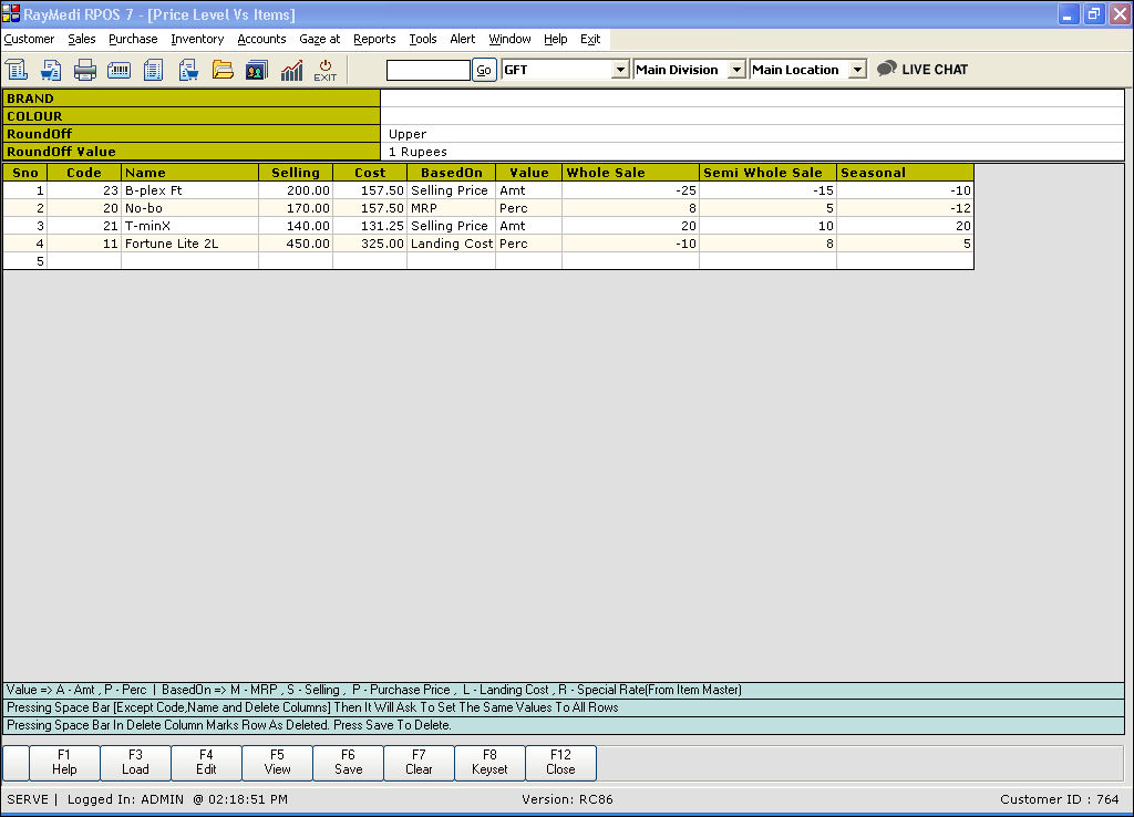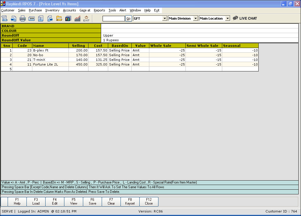 2. To delete an item- Press F4 [Edit] key to open the price level. In edit mode, 'Delete' column is displayed. Place the cursor in the delete column and press space bar. The item gets selected. Now, click Save and the item is deleted.