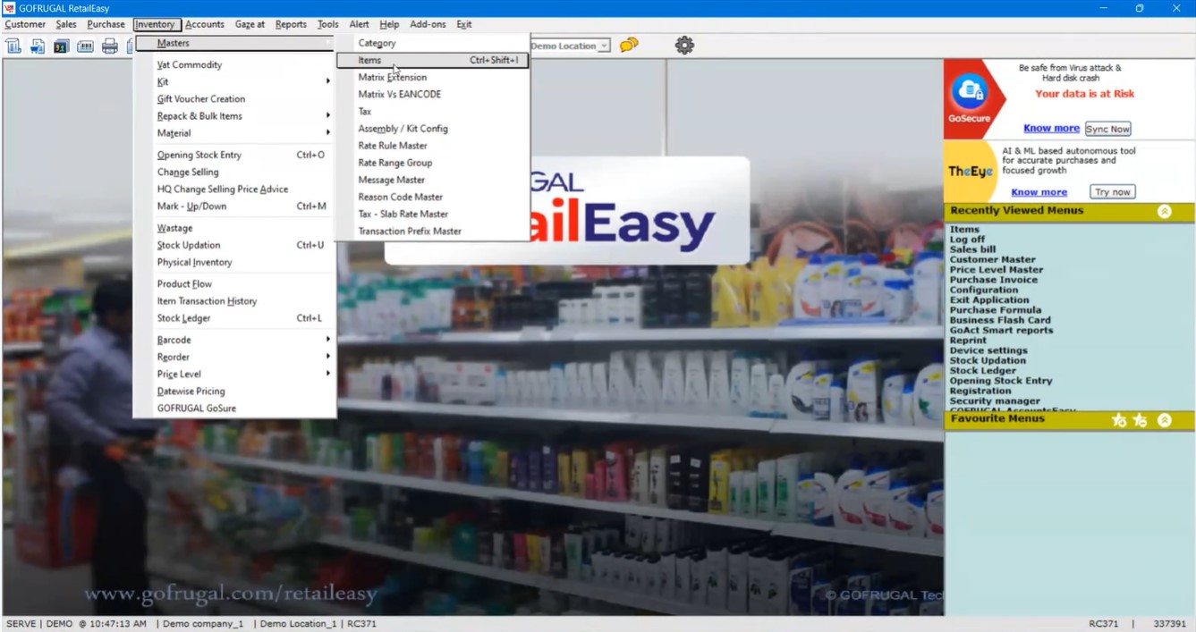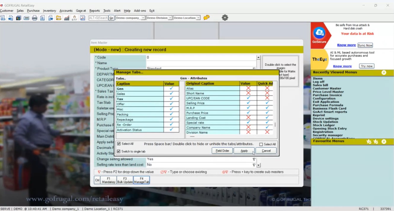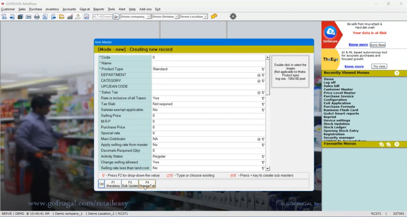 Step 2: Item Master screen will appear. By clicking the left function keys, search and click on Manage Tab.