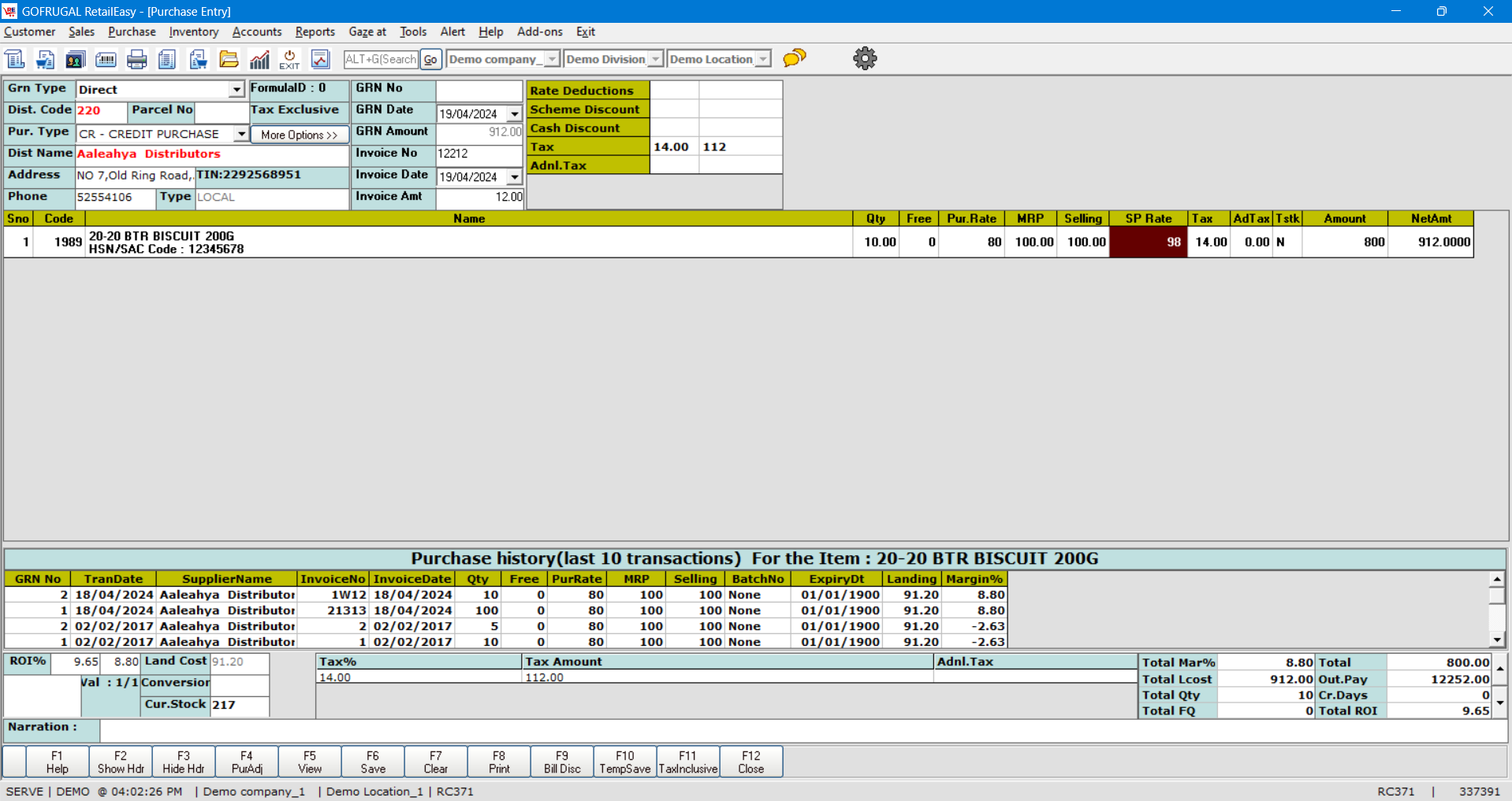 Step 13: Open the Purchase Entry screen and load the items in the screen. You will be able to see the SP Rate (Special Rate) column. You can change the rate from here if you want and it will be replaced in the Item Master.