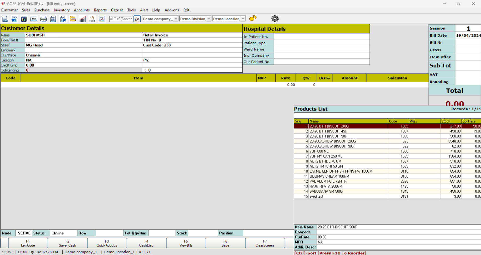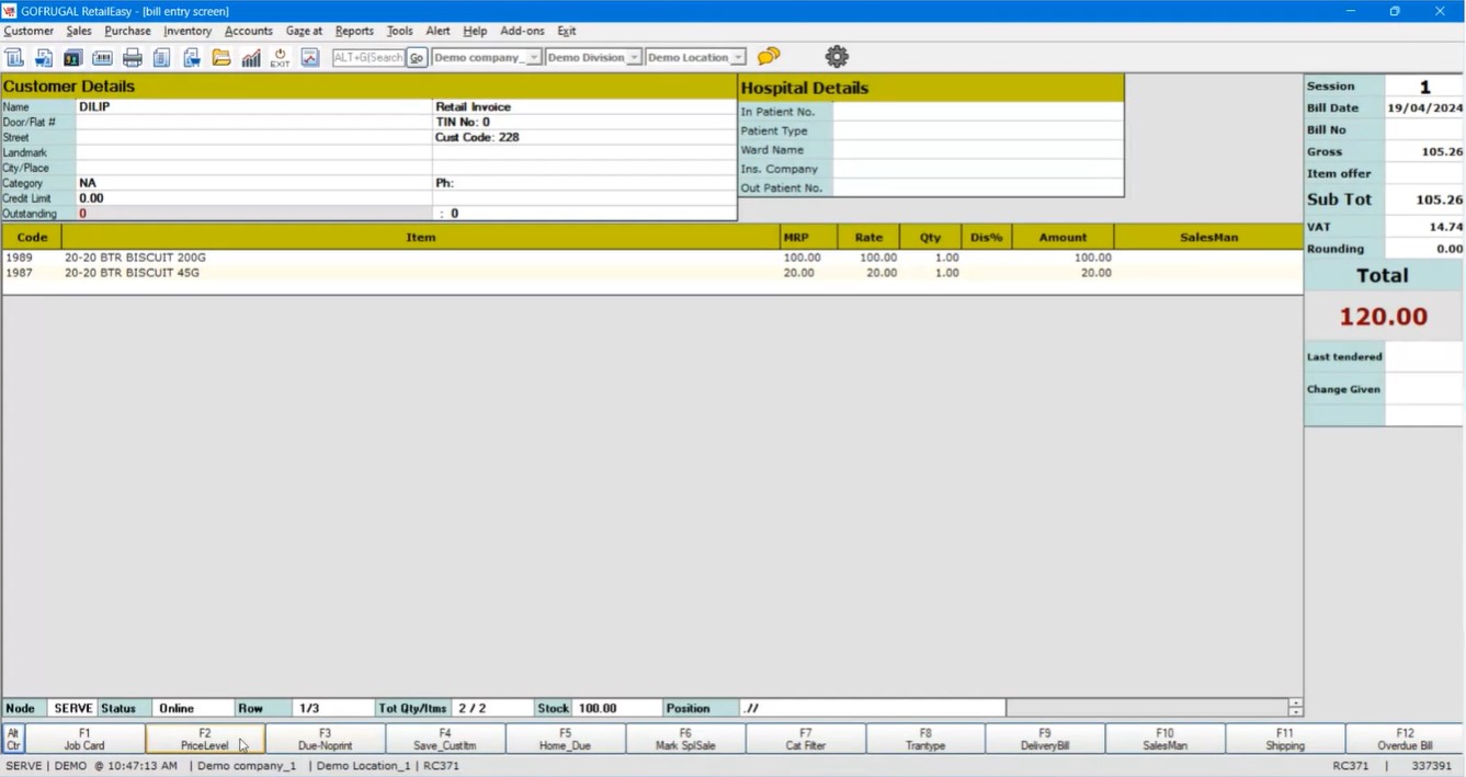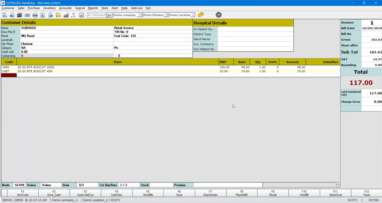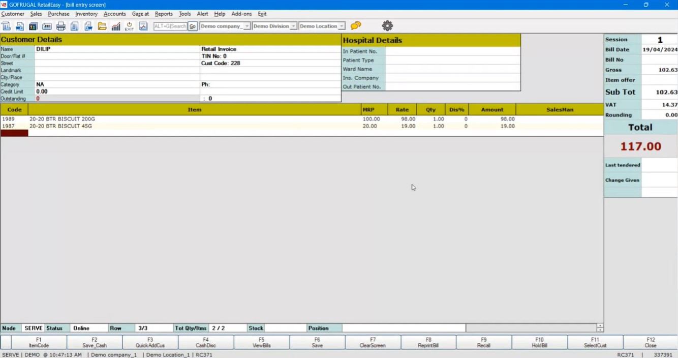 Step 17: Go to Sales > Sales Bill. Bill Entry screen will appear. Select the customer mapped for Special rate and load the same item, then check for the rate it automatically take the special rate. Click Save & proceed for payment mode and Save. Close the screen.