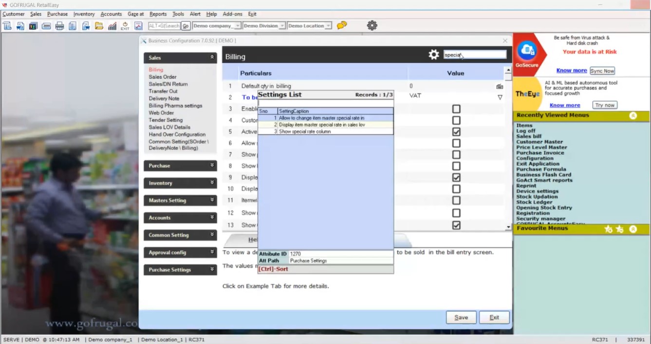 Step 14: Go to Sales > Sales Bill. Sales Bill entry screen will appear. Select any other customer and load the same item mapped for special rate and check for Rate reflecting.