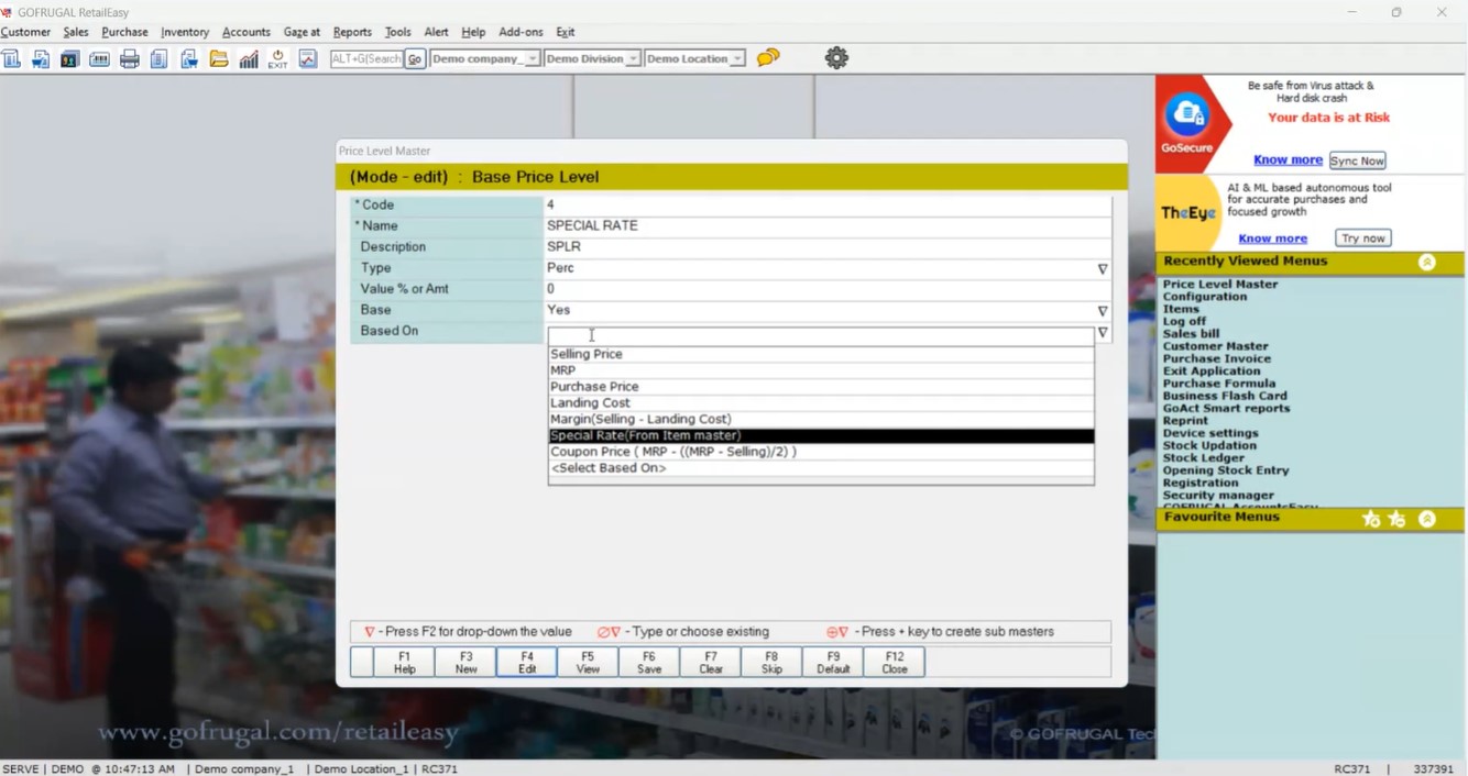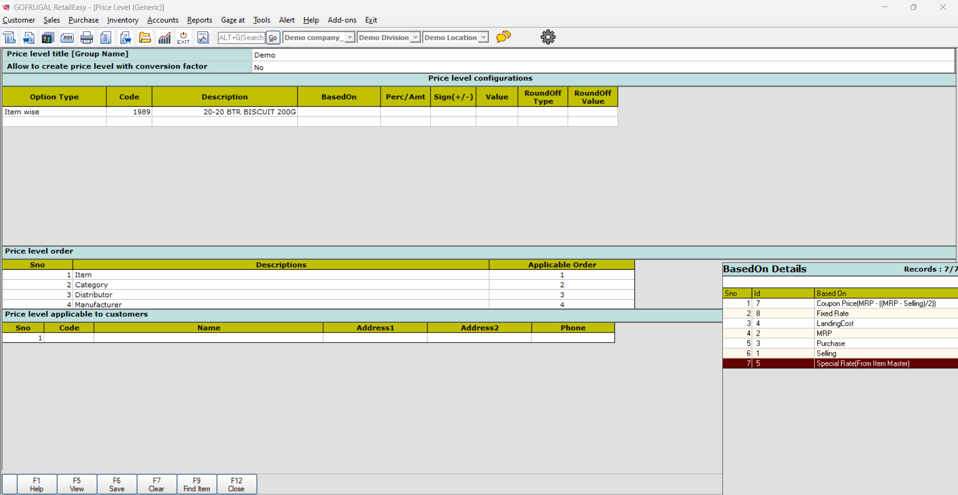 Step 8: Price Level Master screen will appear. Fill in with details and choose Special Rate from Item Master option under Based on option. Click Save.