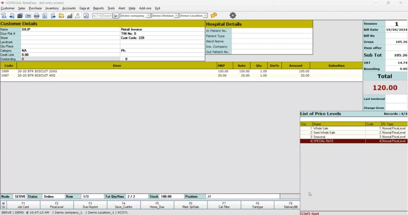 Step 16: Check and verify for Rate changed after applying the Price Level for Special Rate. Click Save & proceed for payment mode and Save. Close the screen.
