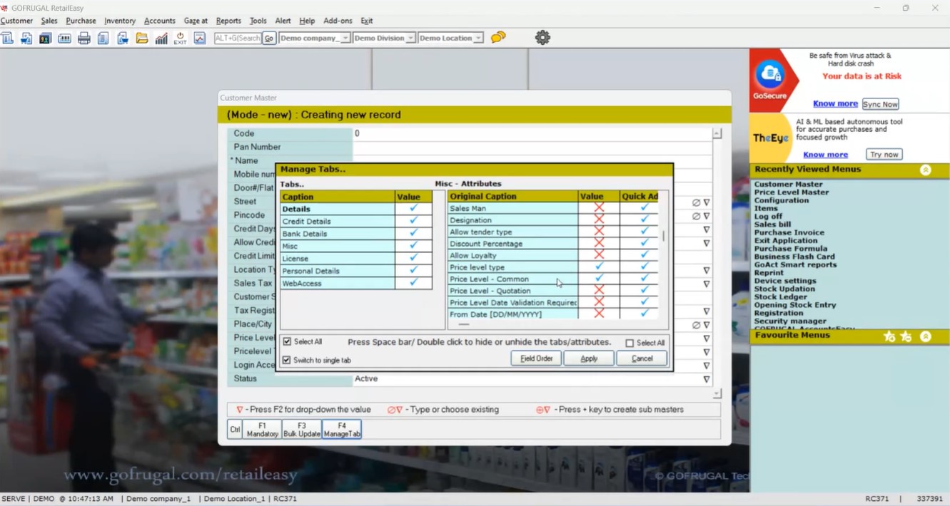 Step 10: Customer Master screen will appear. Click on Manage Tab. In Details tab click the Price Level type & Price Level - Common. Click Apply.