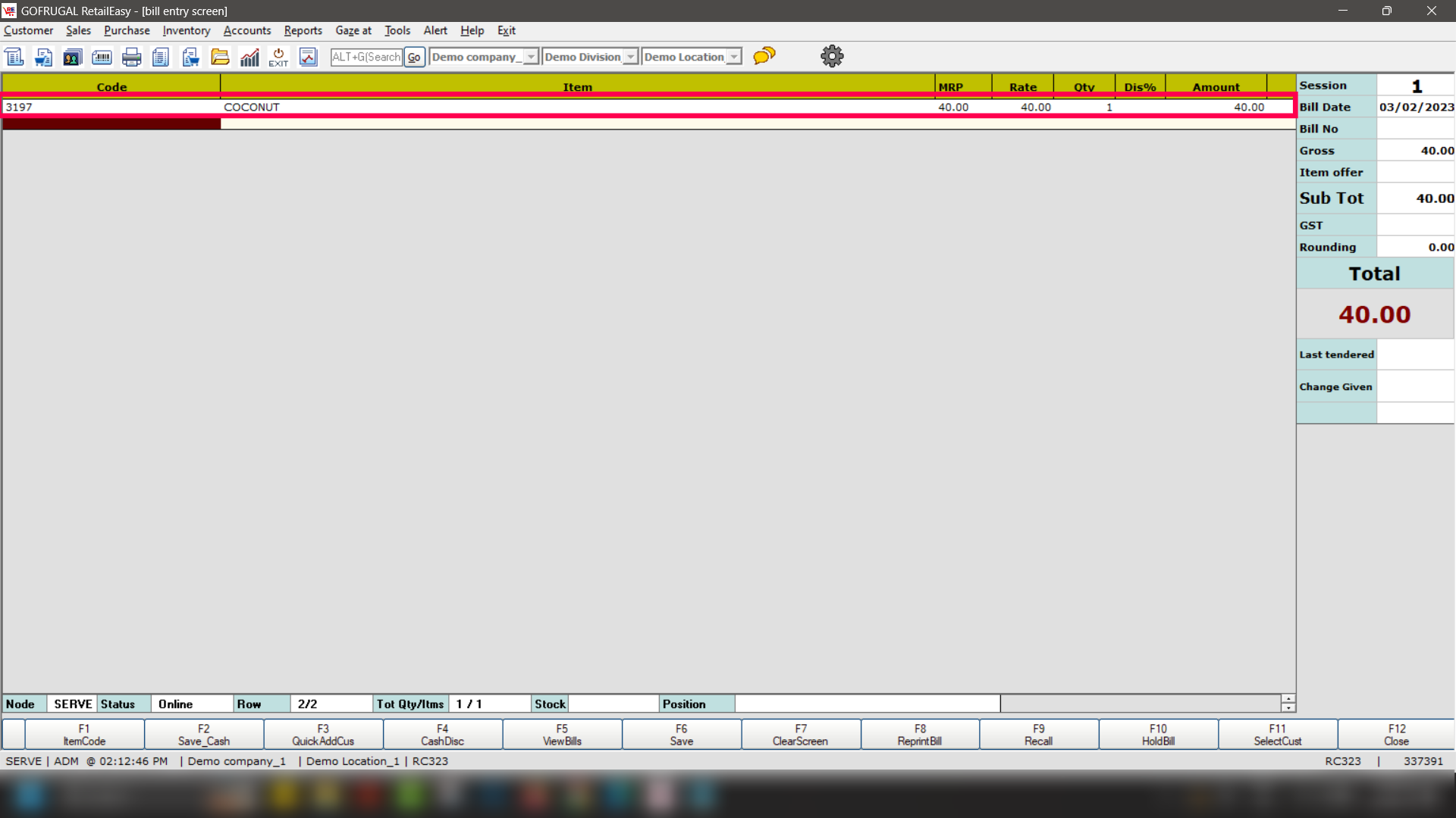 Note: After pressing the enter button, the item will be loaded automatically and the Qty will become 1 [1 Piece of Coconut]