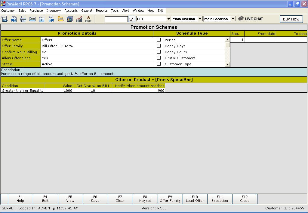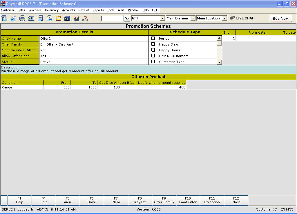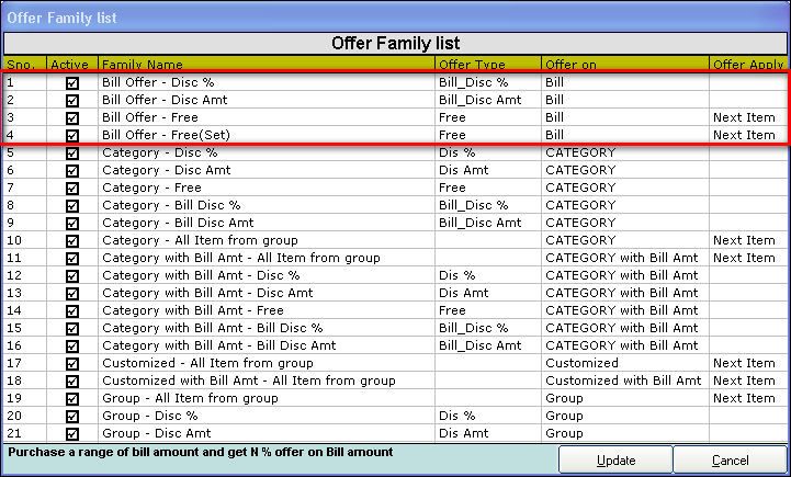 - Bill Offer - Disc Amt (To offer N Amount discount on the total Bill amount)