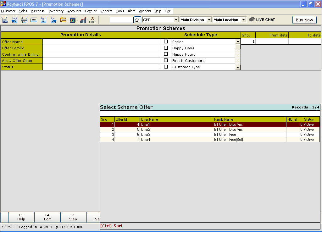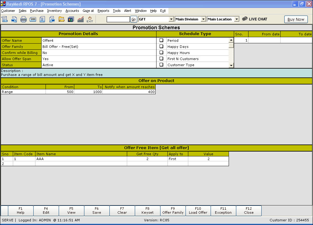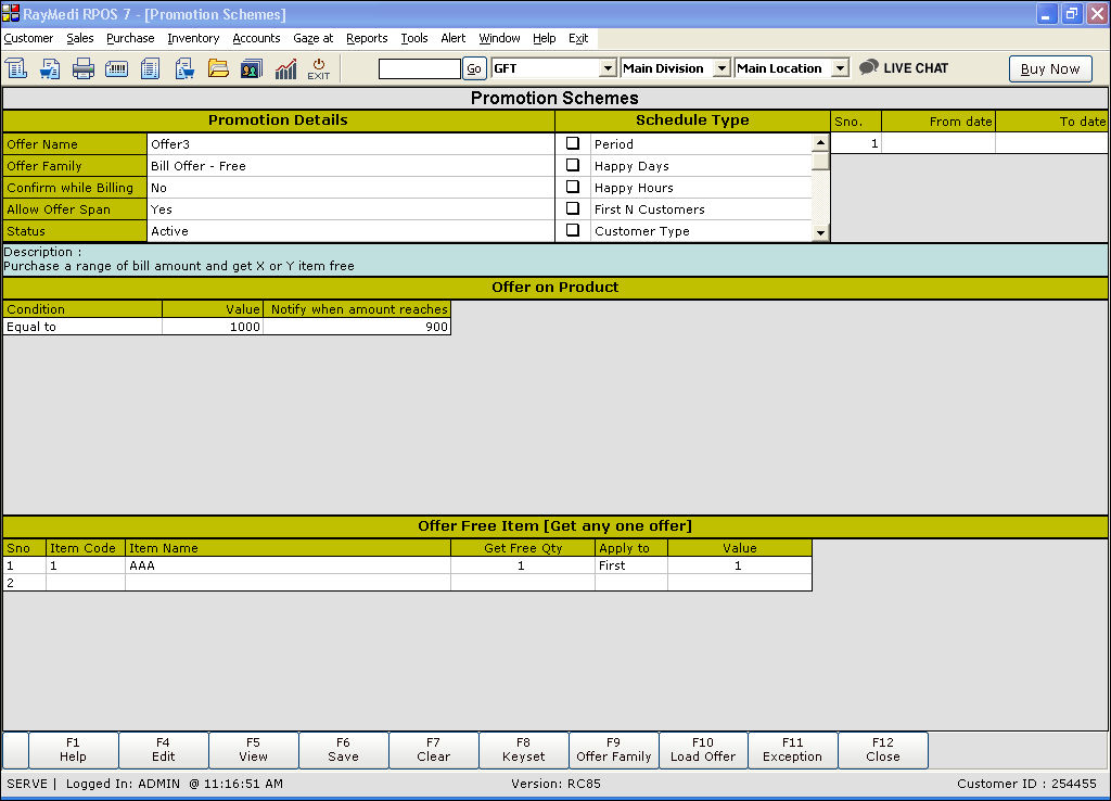- Bill Offer - Free (To offer an item (X or Y) free for the bill)