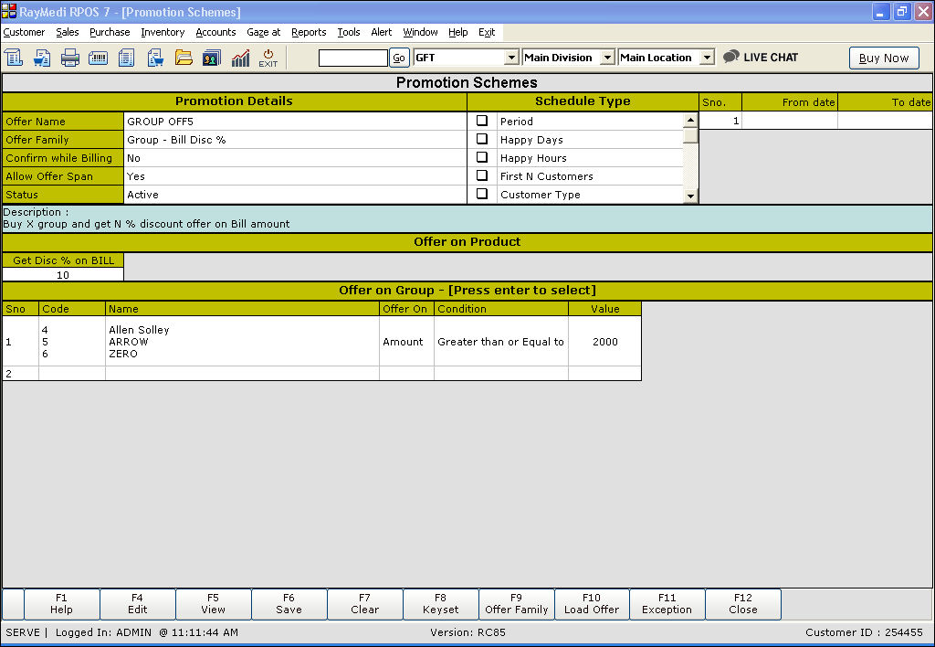 5. Group - Bill Disc% (To offer N% discount on the total bill amount on selling X group)