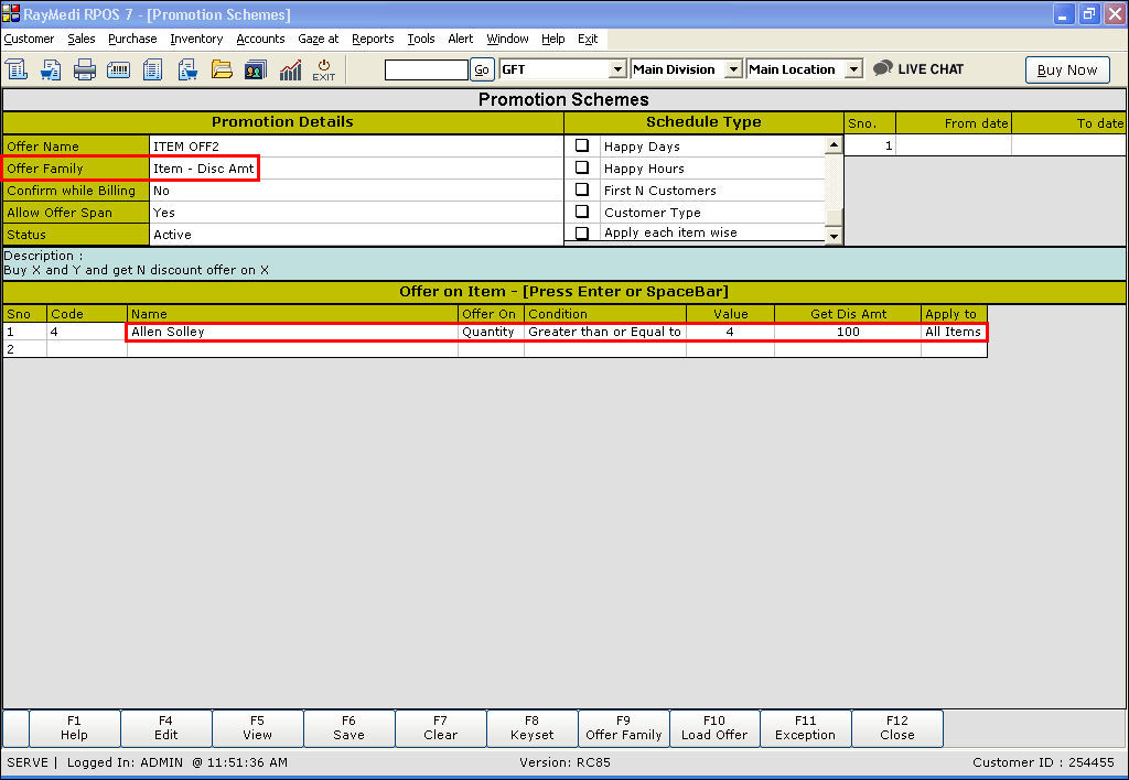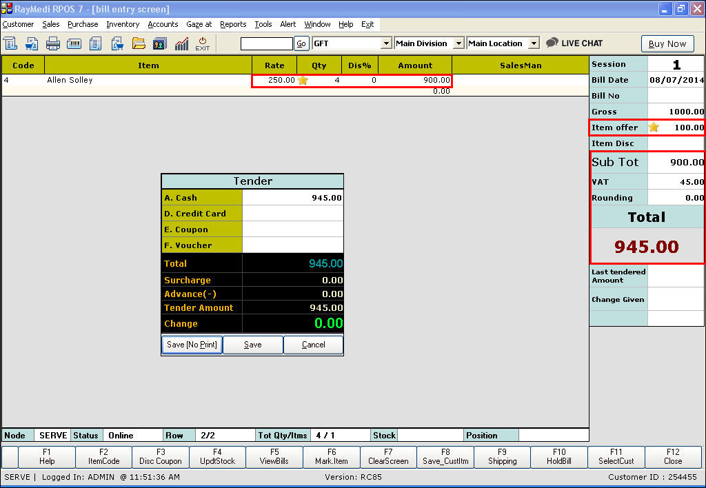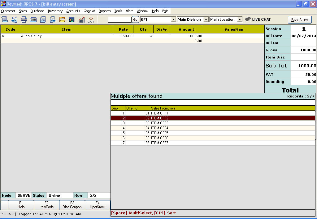 Applying Group Offer Follow the steps below to apply the created offers: Click Sales >> Sales Bill to open the billing screen Select the items from the item LOV Invoke the tender screen and the offer is applied for that bill If you have created ...