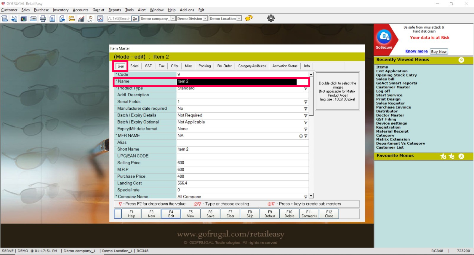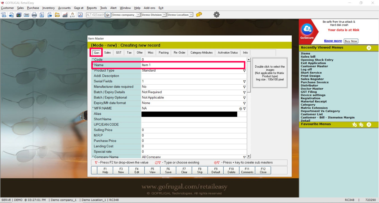 Step 1: In Item Master screen. Go to the Gen tab and add an item name.