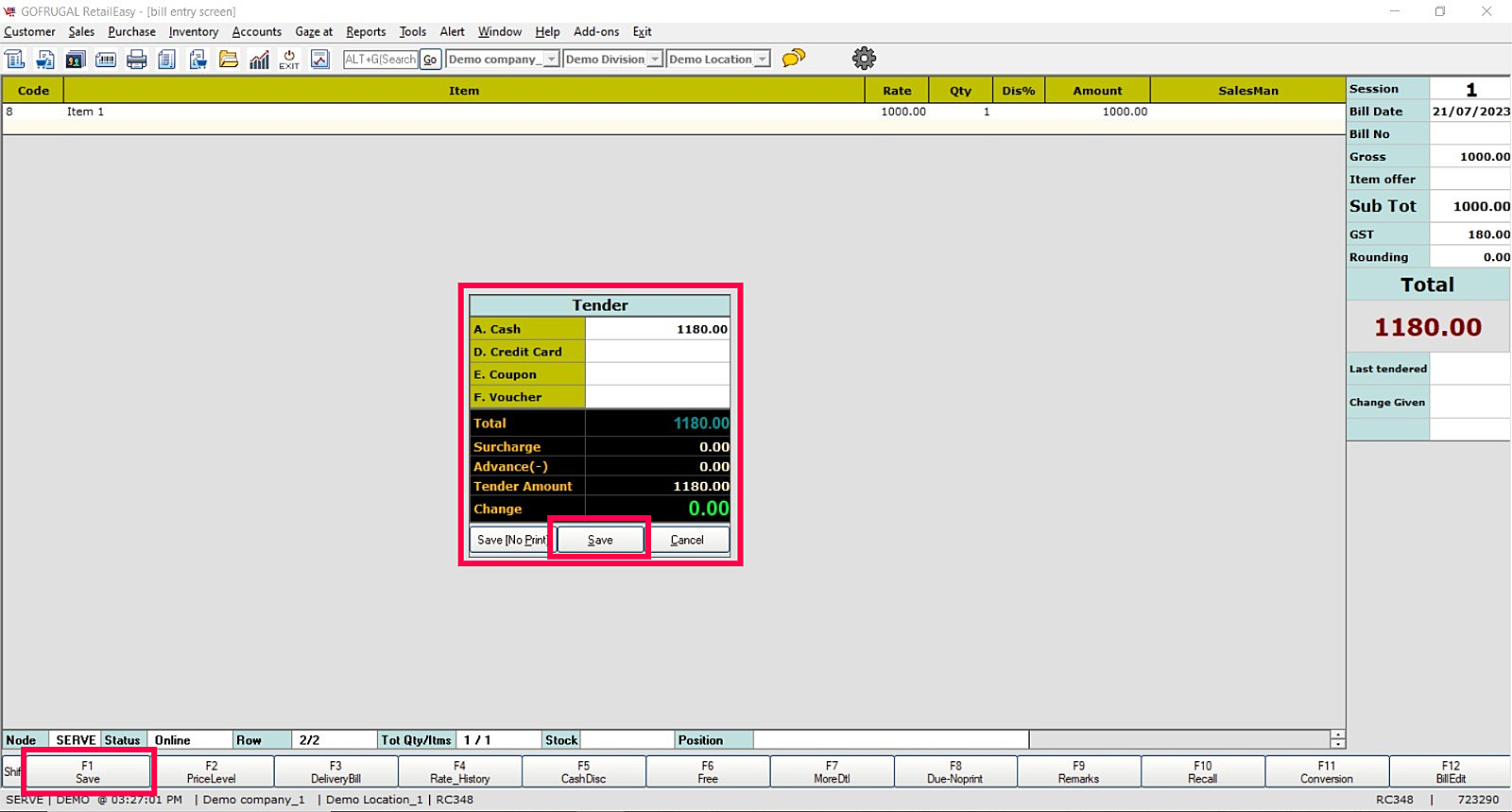 Step 8: Click 'Save' function key. Tender screen will appear. Select the Payment mode and click Save.