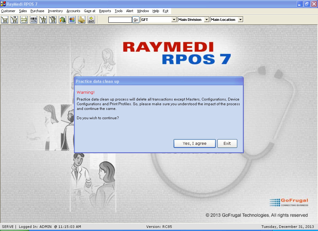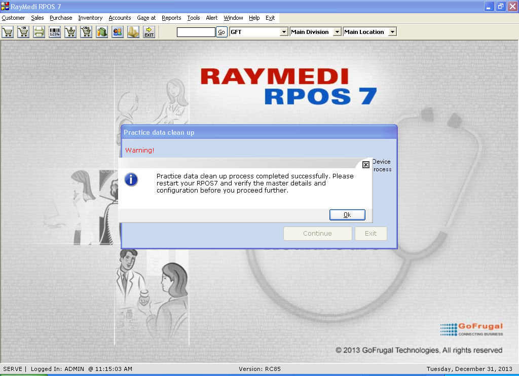 5. The practice data cleanup is completed and the system prompts for restarting the application.