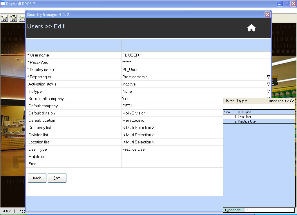 - In the User Type field, press the ENTER or F2 key and select the option Practice User