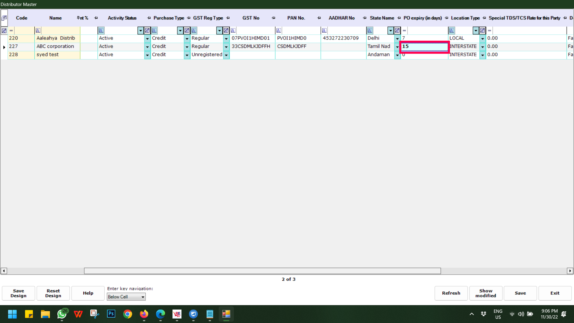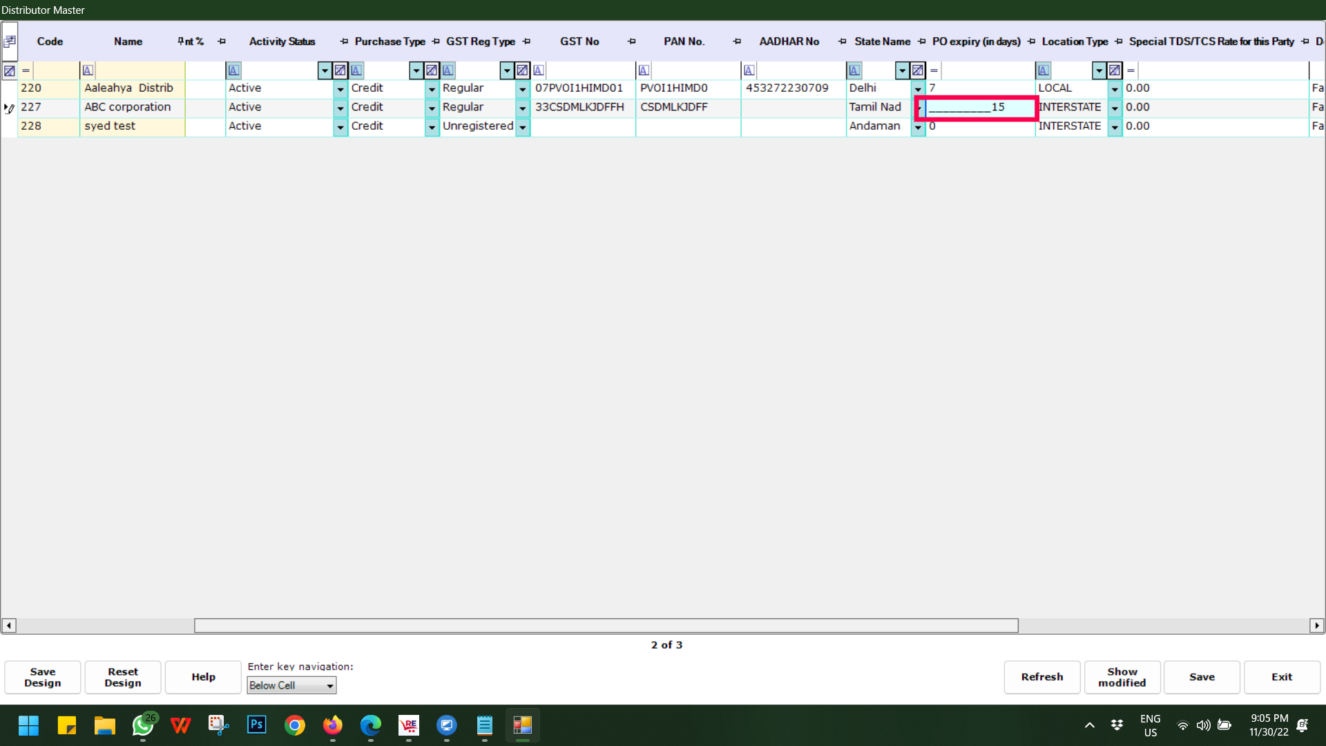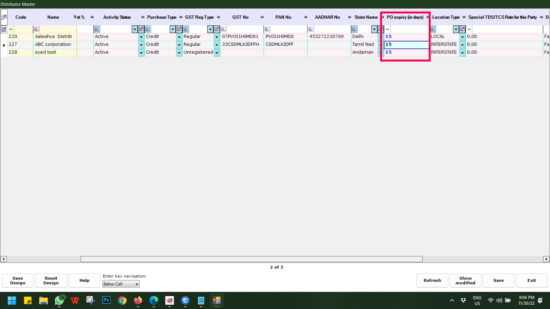 Step 3: To update in a bulk based on different criteria/filters like Purchase Type, GST Reg Type, Distributor category or Credit Days etc, filter as per your requirement and then double-click on the PO Expiry (in Days) field and put the desired number.