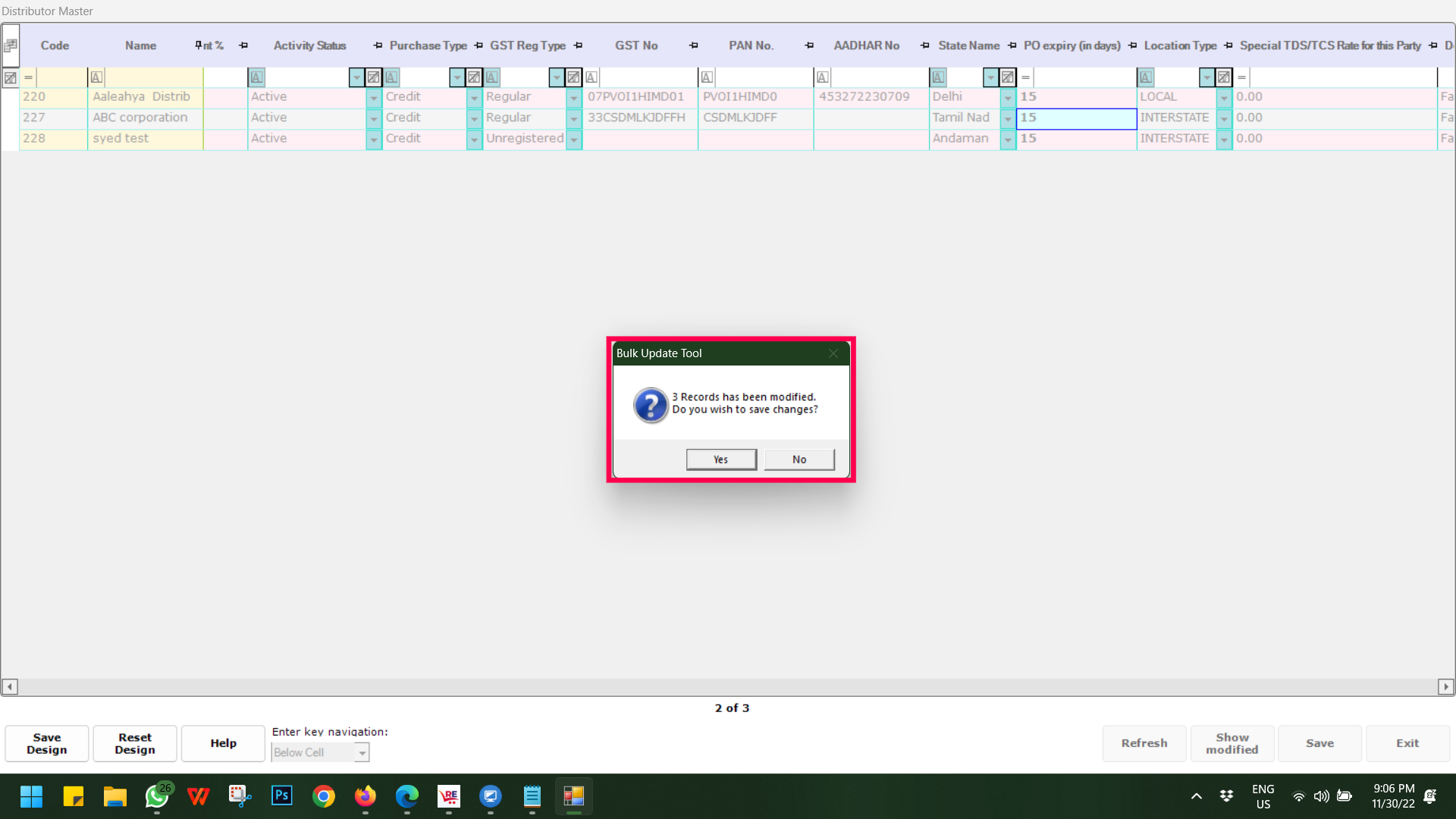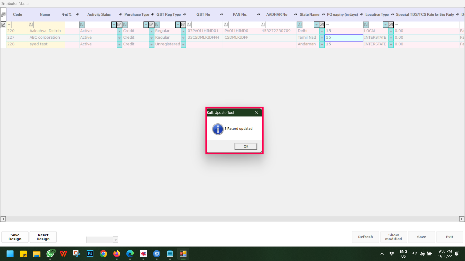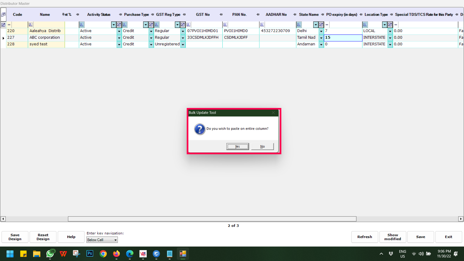 Step 3: To update in a bulk based on different criteria/filters like Purchase Type, GST Reg Type, Distributor category or Credit Days etc, filter as per your requirement and then double-click on the PO Expiry (in Days) field and put the desired number.