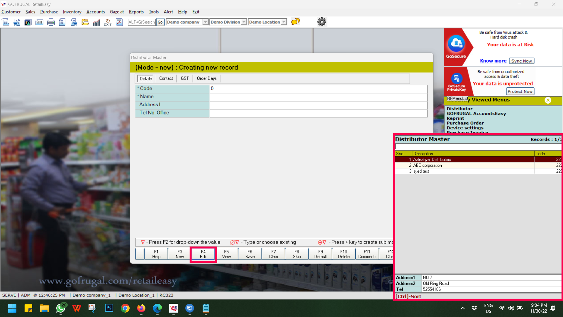 Step 2: Then click on F3 New or F4 Edit button as required. In case of edit, select the Distributor name from the list.