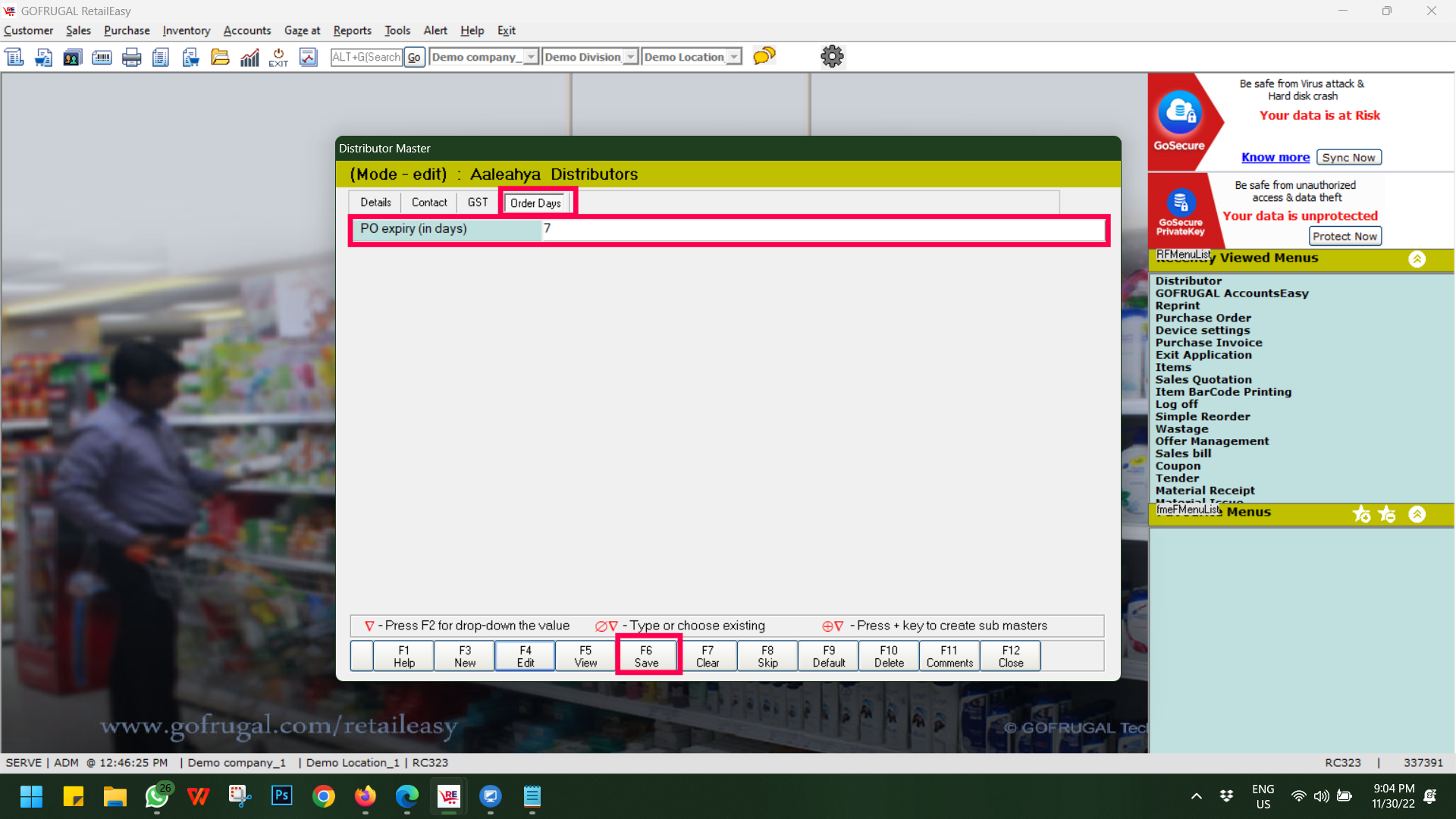 Step 3: Then click on the Order Days and out the desired value in the "PO Expiry (in Days) field, and then click on F6 Save to save the settings.