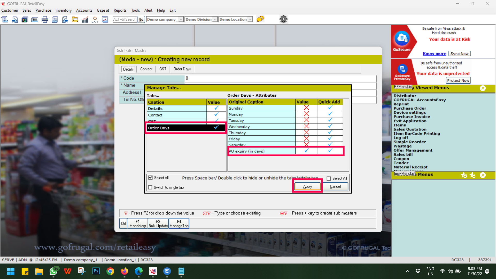 Step 3: Then click on the Order Days in the Left Panel and then double-click on "PO Expiry (in days)" option to activate the same and then click on Apply button.