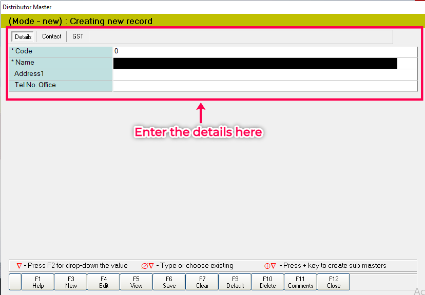 Step 2: Under the Details tab, enter the distributor name, address, and contact information in the Details section.