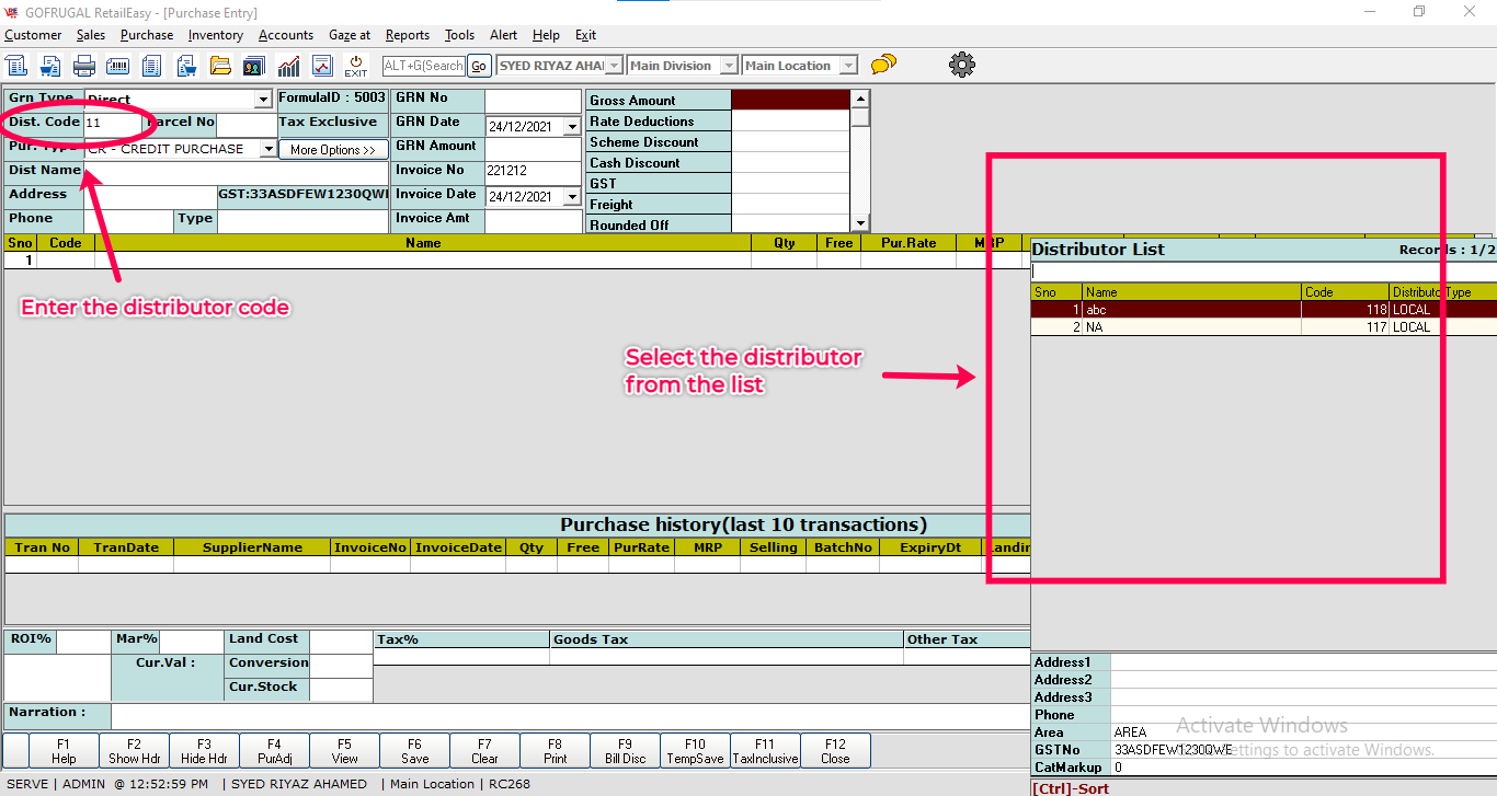 Enter the distributor code and click enter to select from the distributor list.