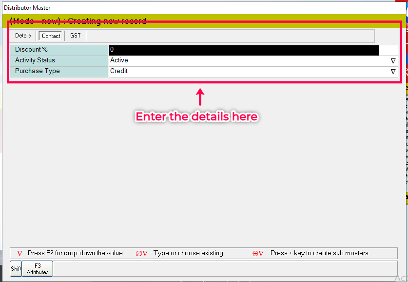 Step 3: Enter the Discount percentage, Status of the distributor, and Credit type in the Contact section.