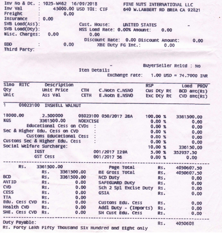 18,000 Kgs of walnuts were imported on this invoice with the unit price as 2.5 dollars and the same same has been converted into INR 3361500 on which 100% RSP is applied and 10% Social welfare charge (INR 336150) is levied and then 5% IGST (INR 352927.5) has been calculated which gives the final amount to be paid. i.e. INR 4050608.
