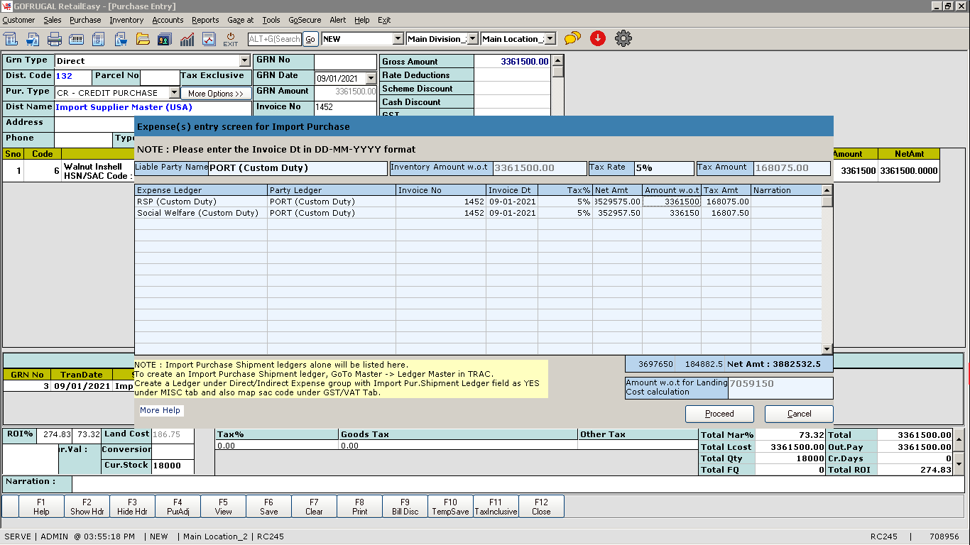 In the expense window, select the liable party name and the custom duty expenses, input the invoice date (DD-MM-YYYY Format) and tax rate and then click on proceed.