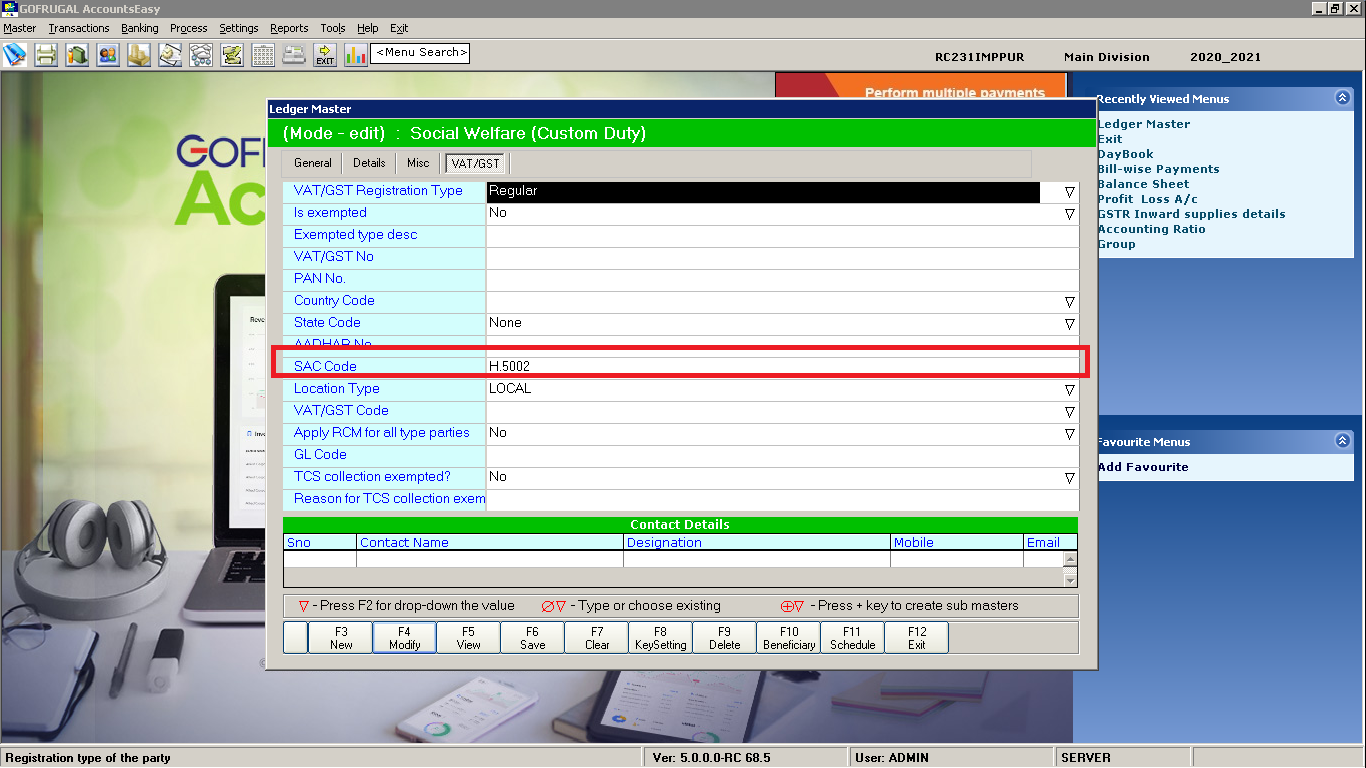 Under the Vat / GST Tab - > Input the SAC code which is a mandatory one.