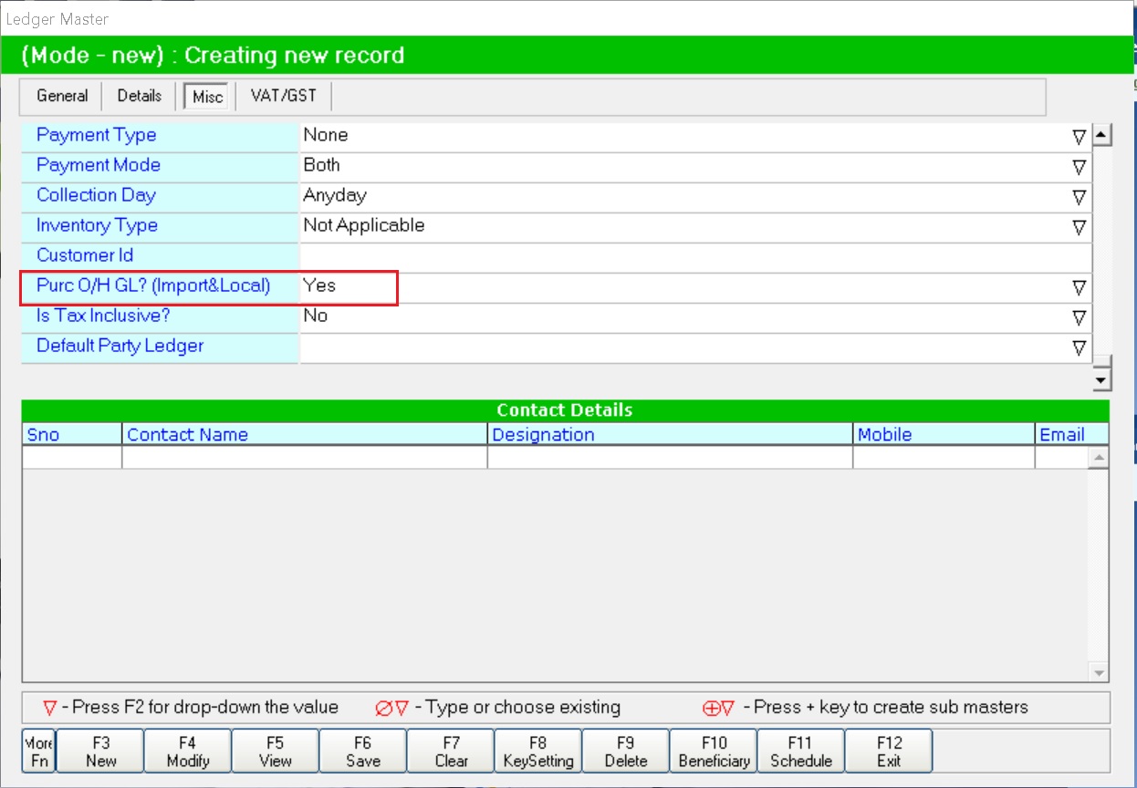 Under the Misc Tab - "Purc O/H GL? (Import&Local)" should be chosen as " Yes"