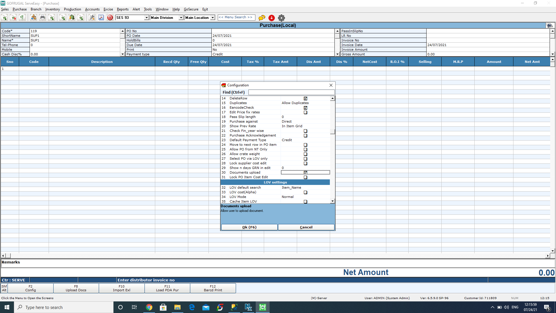Step 1: For users using RPOS 7 enable user wise configuration called "Document upload", for users using DE enable the user wise configuration called "Auto documents upload", and for RPOS 6 users enable a configuration called "Documents upload" in the purchase entry screen.