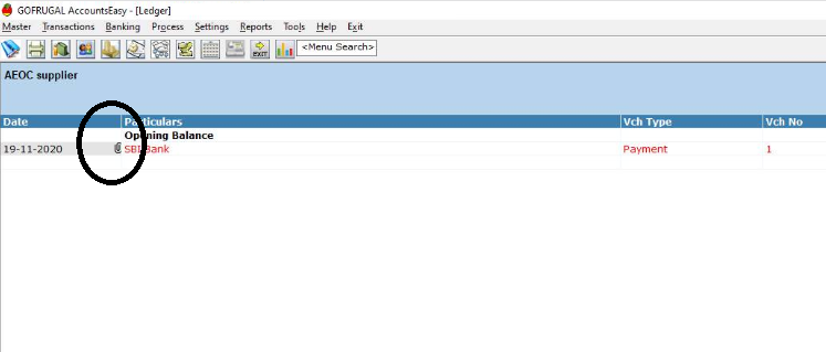 Step 7: Go to the ledger report of the party, drill down to the below screen and click on the attachment symbol