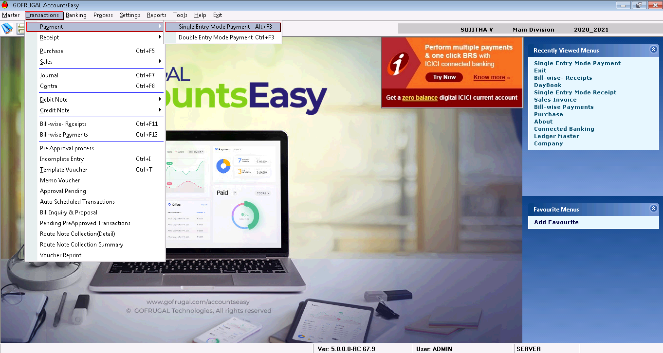 Step 1: Go to the single entry mode payment screen in AccountsEasy