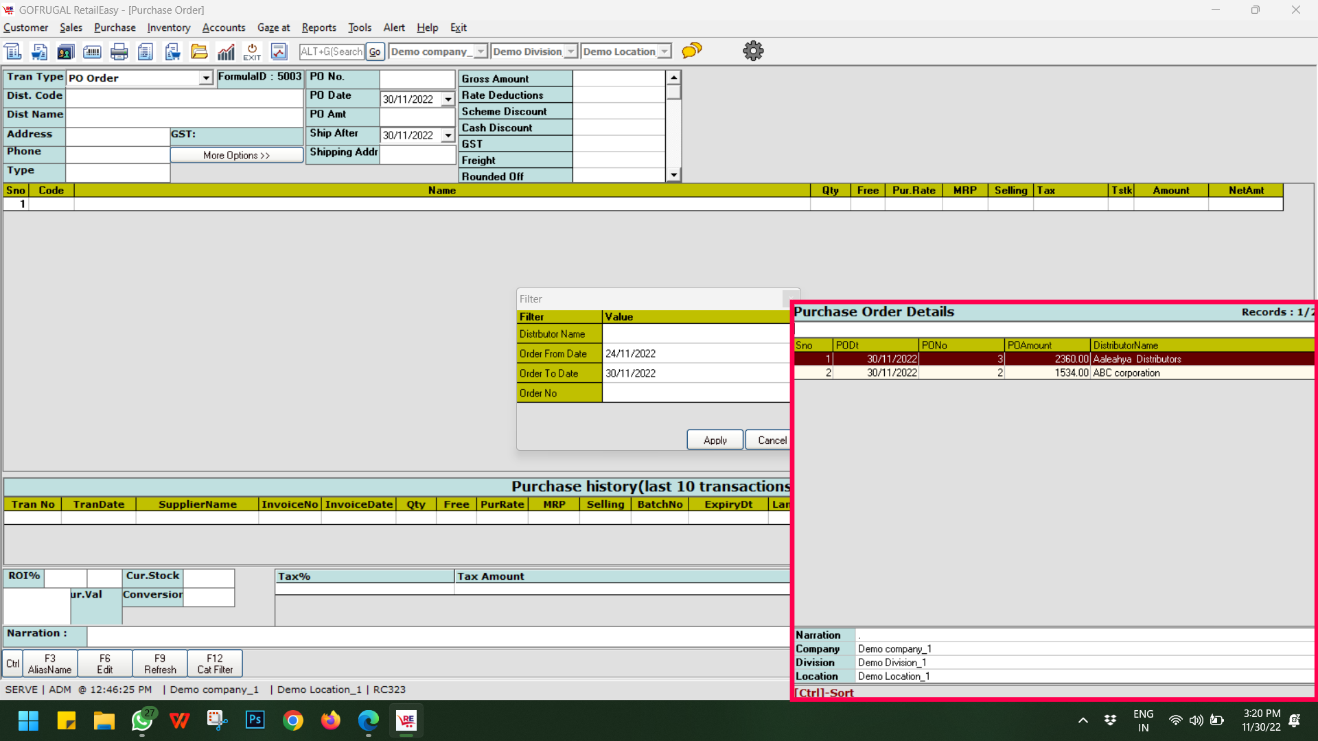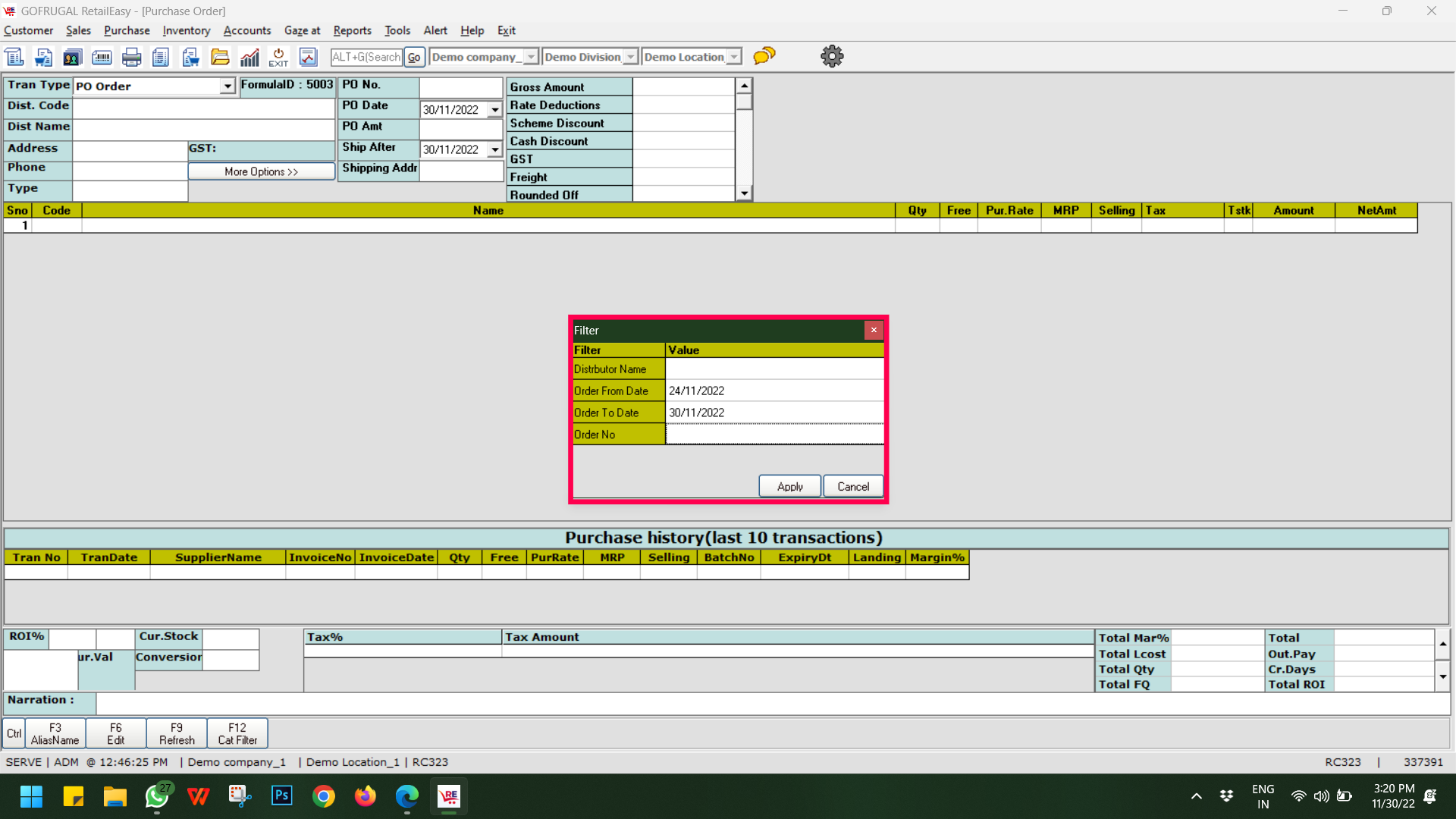 Step 3: If you want to filter Distributor and Date Range put the same, else press enter in the Order No box.