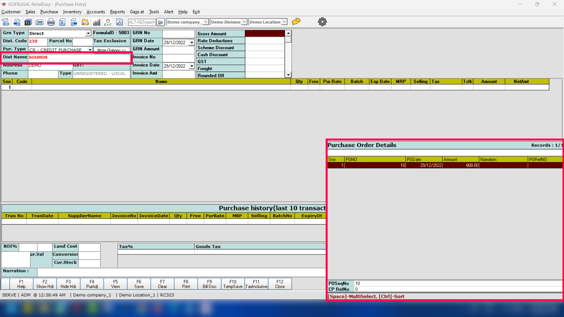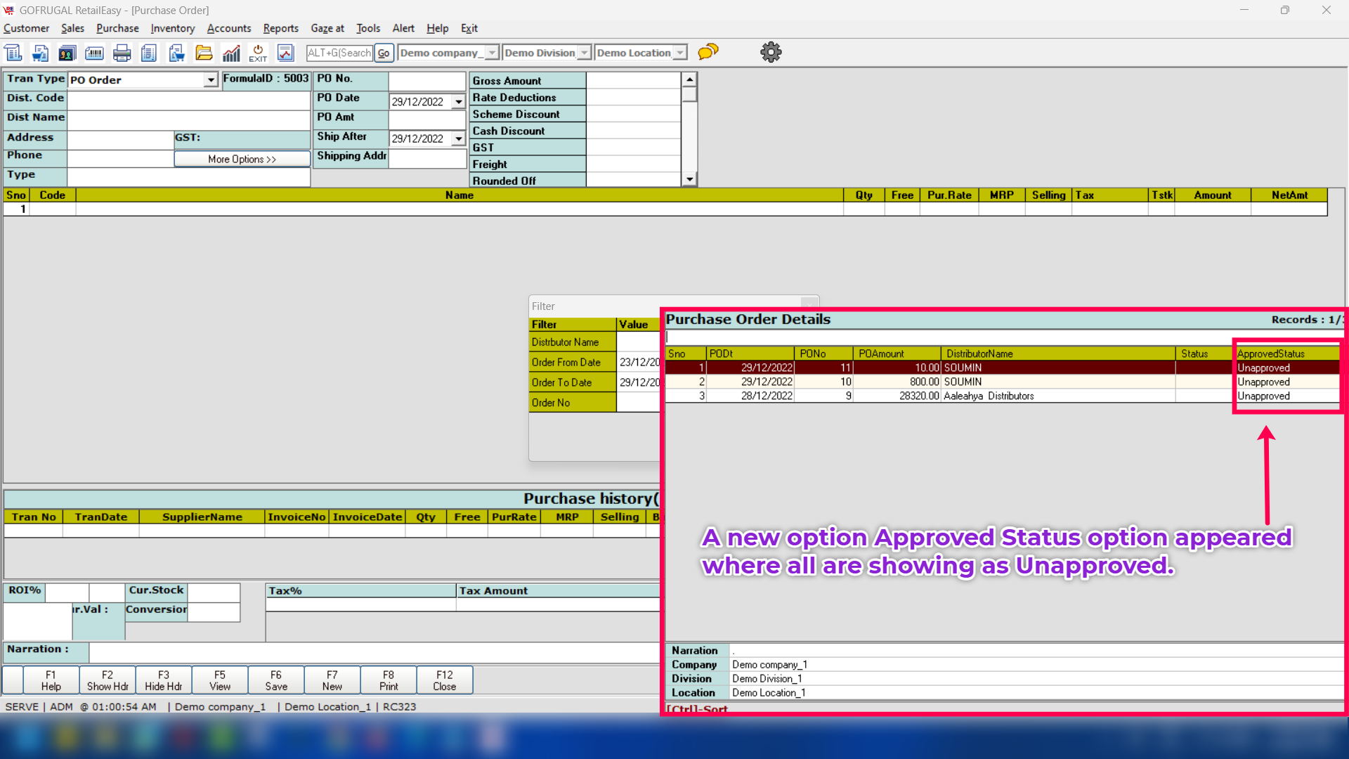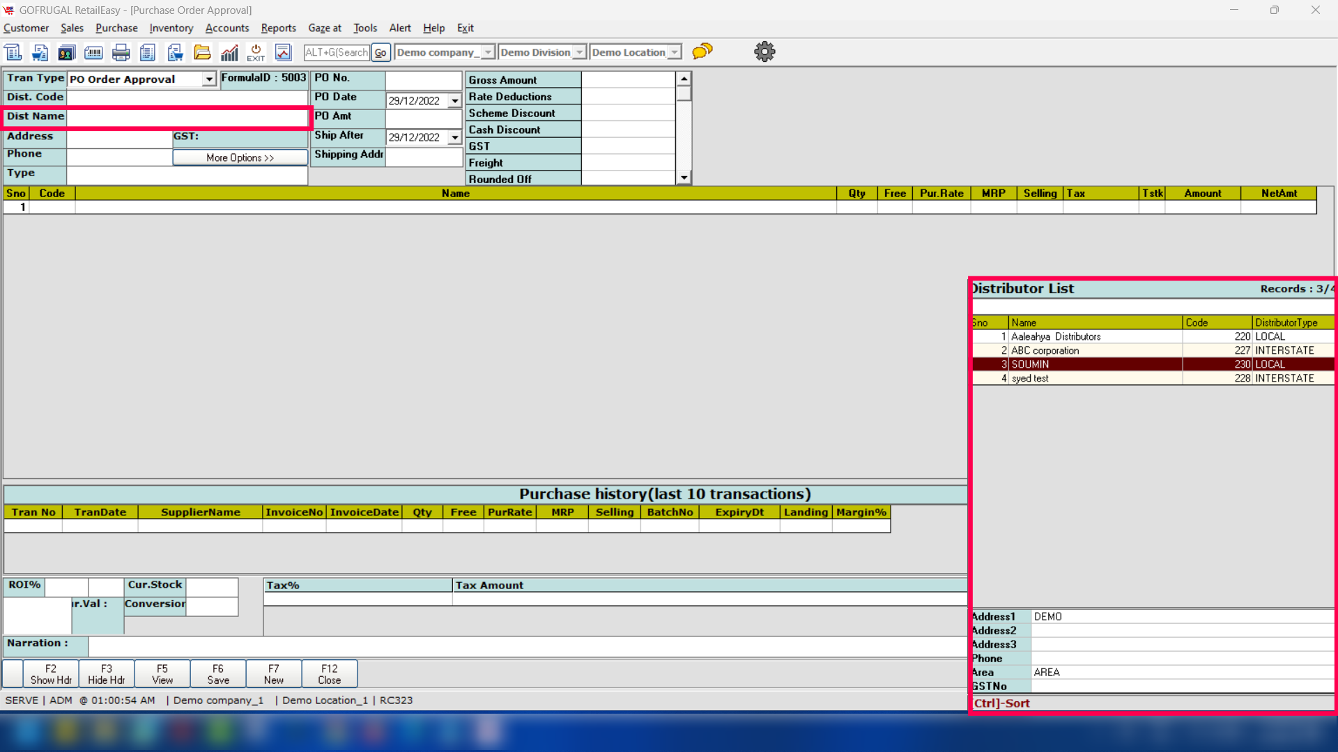 Step2: Press Enter Key in the Dist.Code and select the desired supplier/Distributor from the Distributor List. You will see all the Purchase Order details will be loaded in the Purchase Order Approval Screen. As the approval process is working, that's why it's coming in this screen.