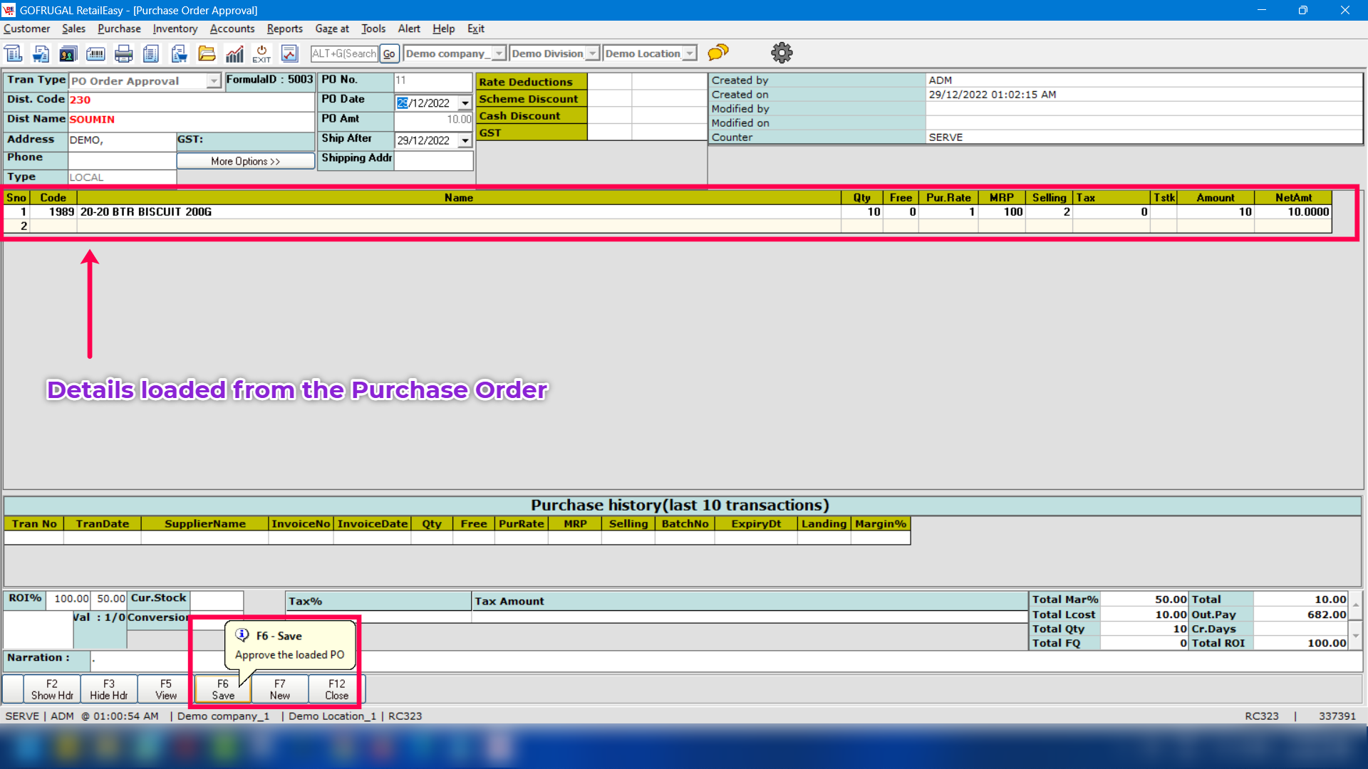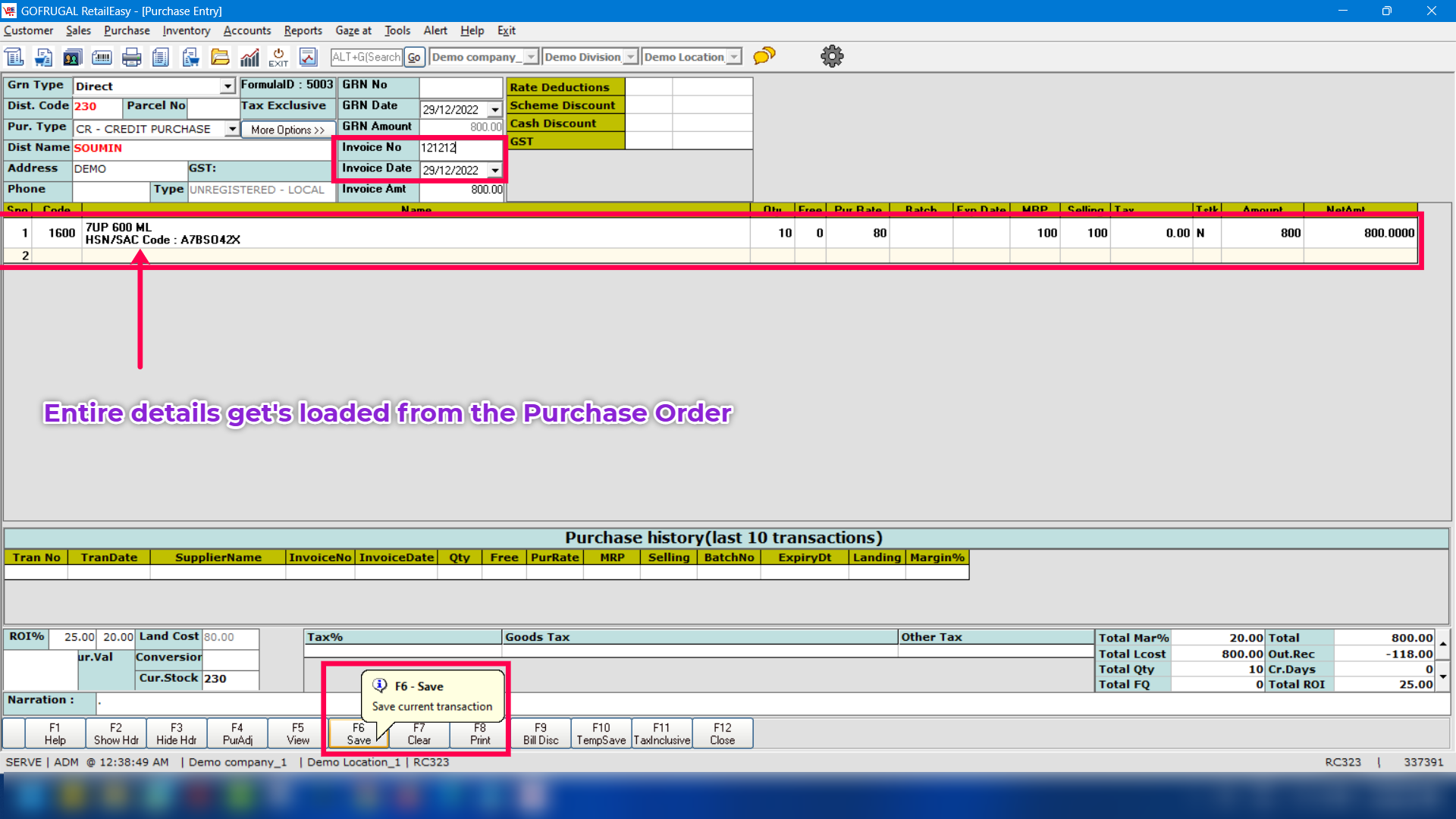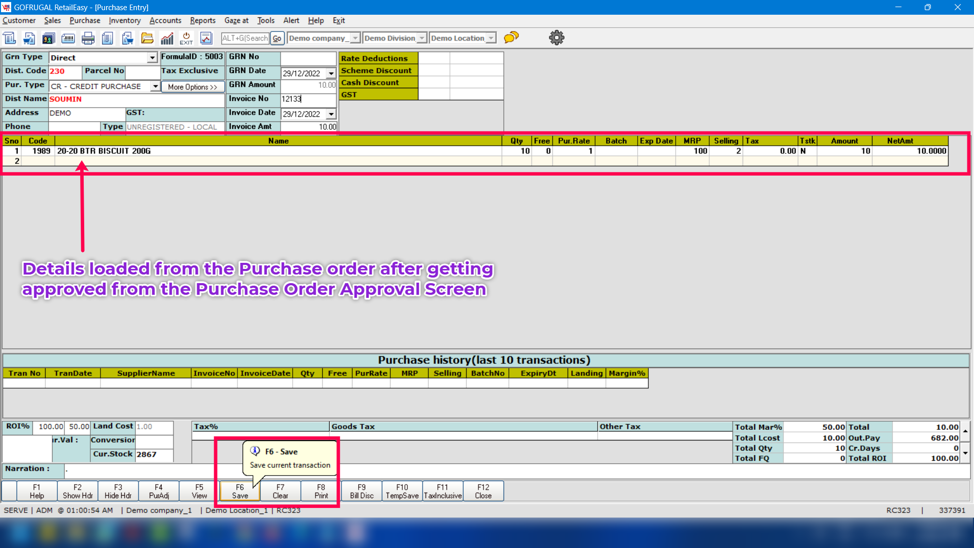 Step4: All the details will get loaded from the Purchase Order after getting approved from the Purchase Order Approval Screen. Click on F6 [Save] to save the entry.