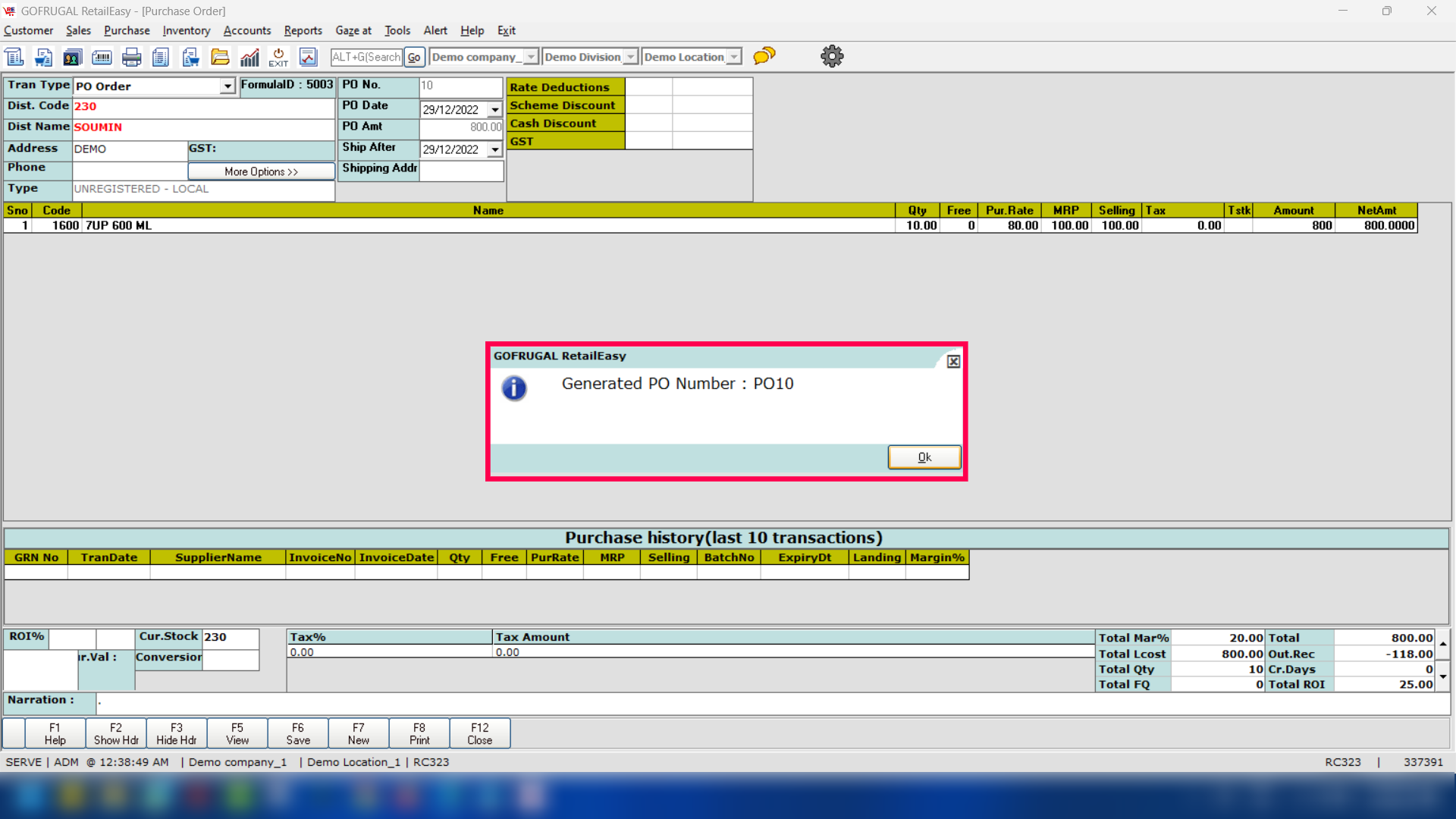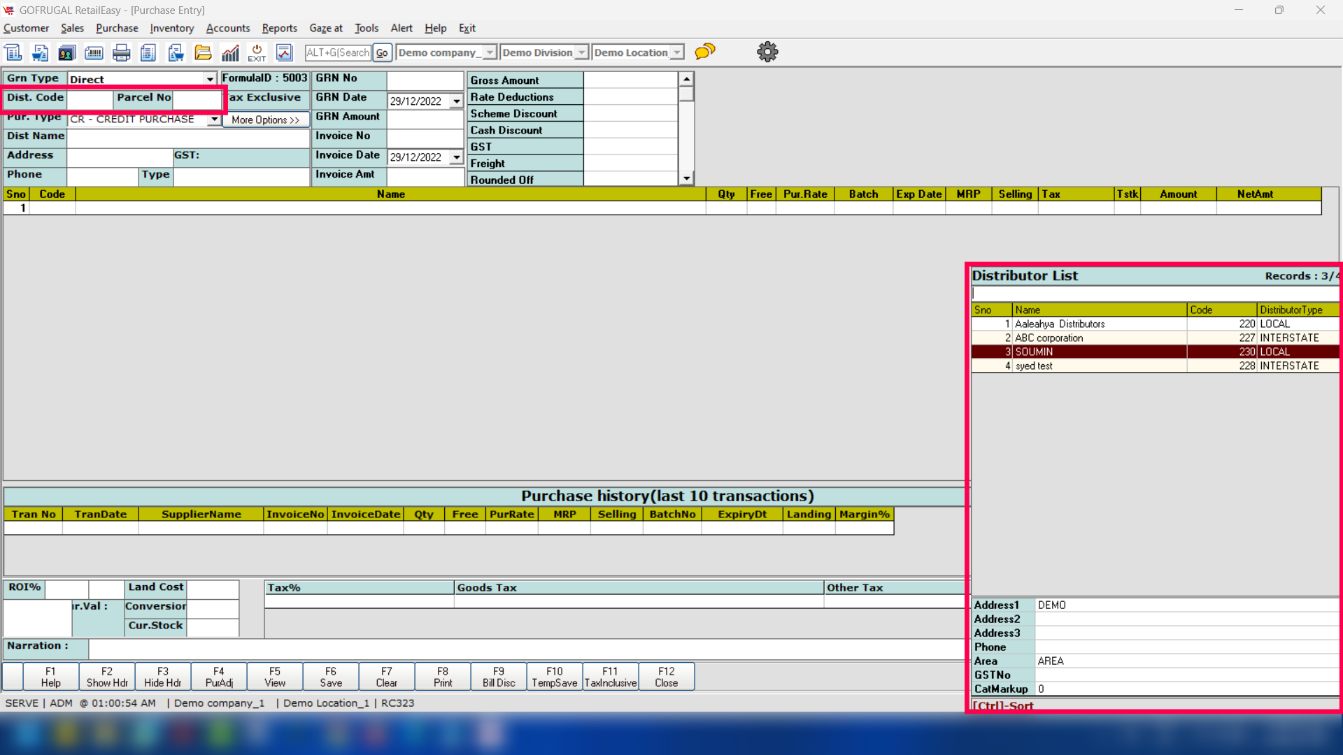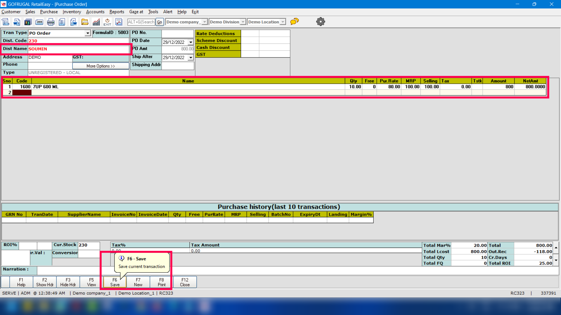 Step2: Select the Distributor and take any items with relevant details, and click on F6 [Save] to save the Purchase Order entry.