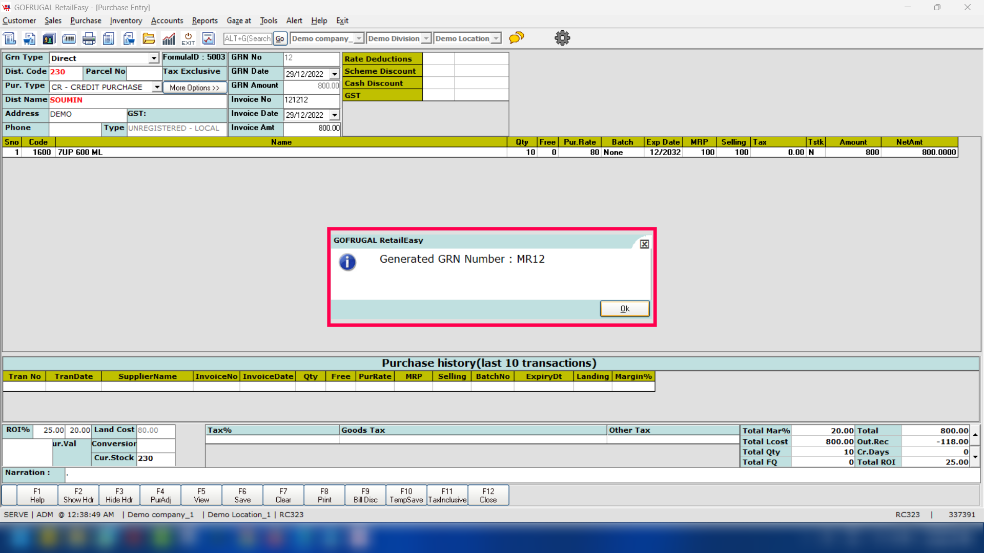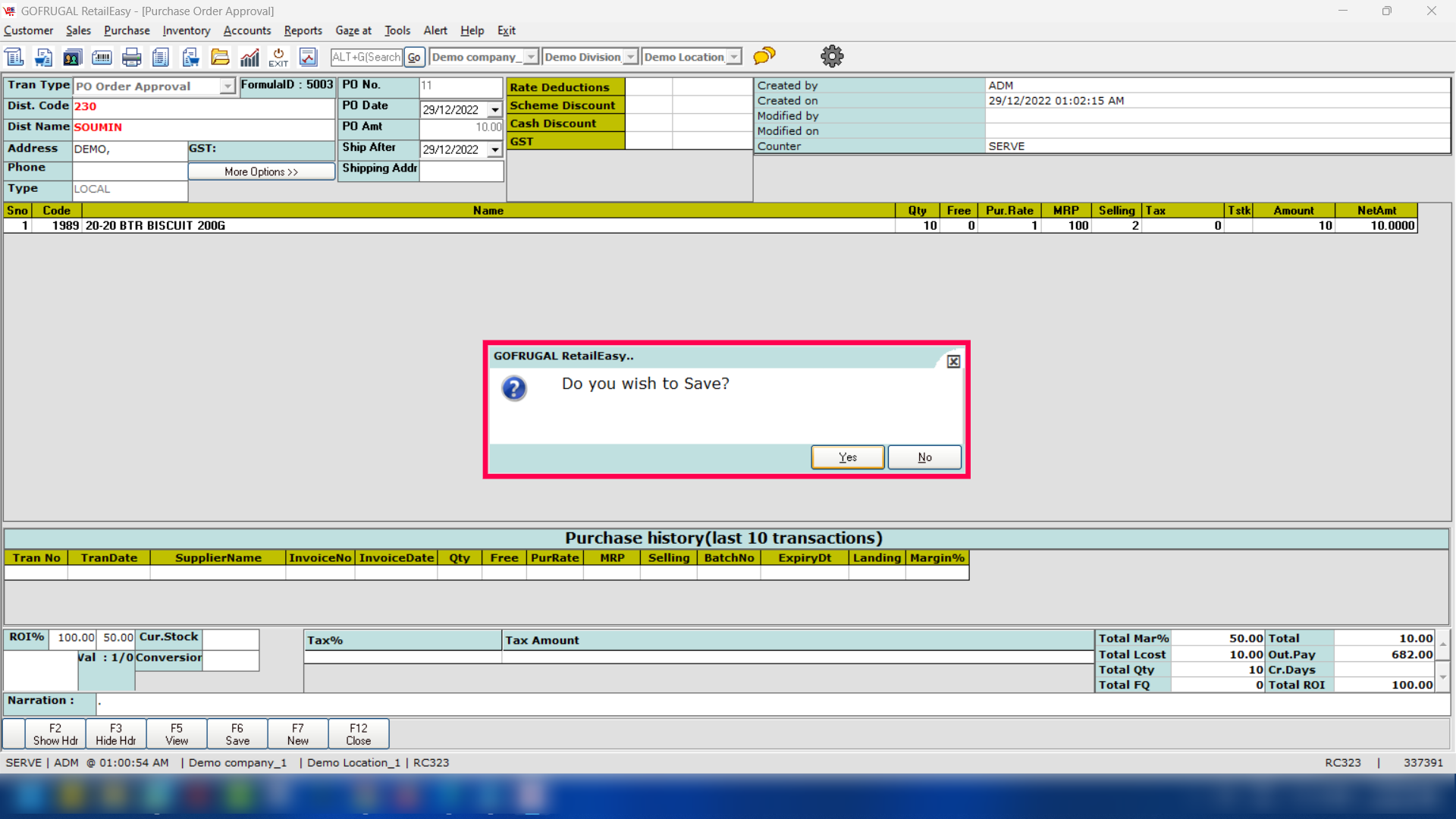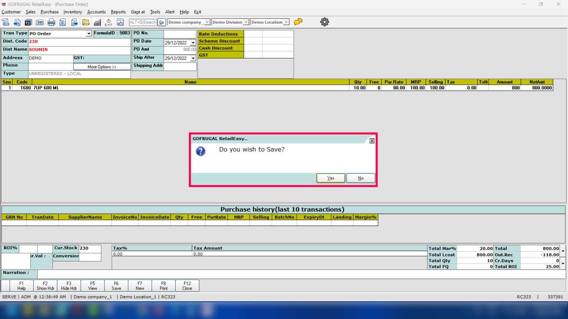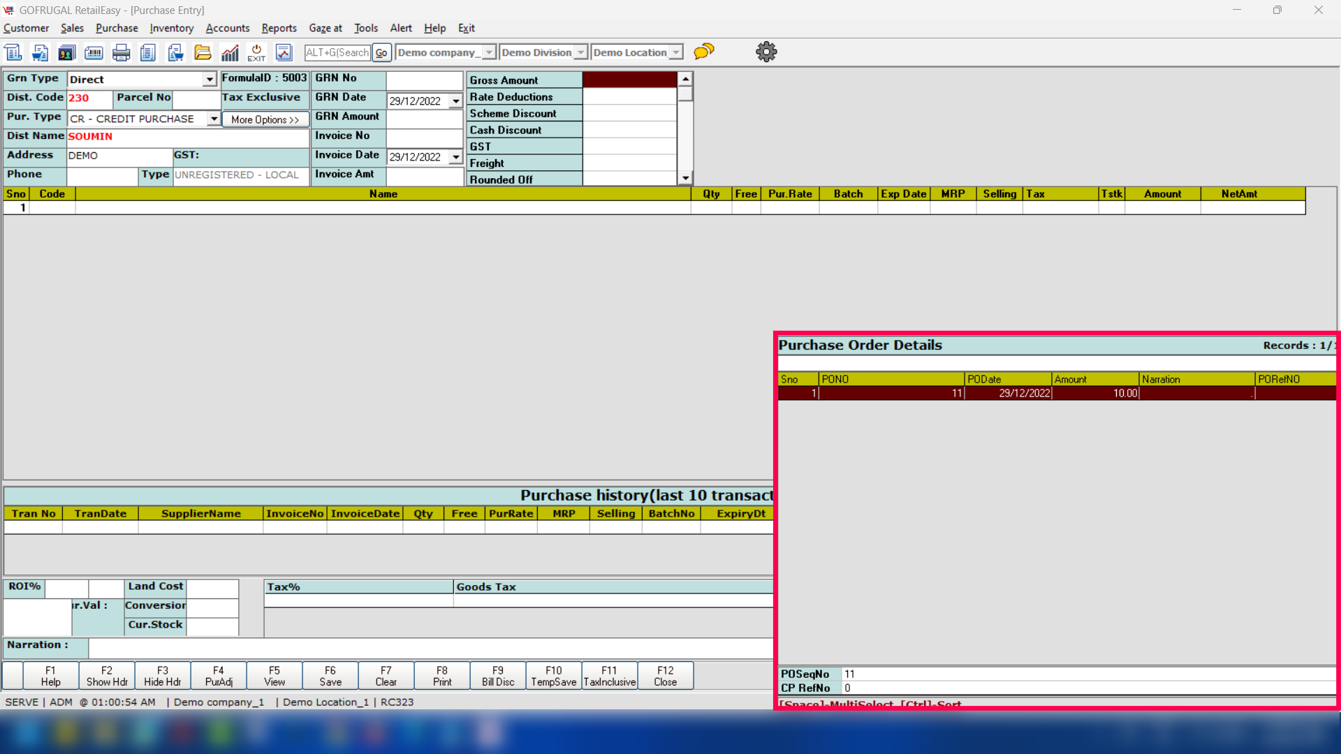 Step2: Select the Distributor and take any items with relevant details, and click on F6 [Save] to save the Purchase Order entry.