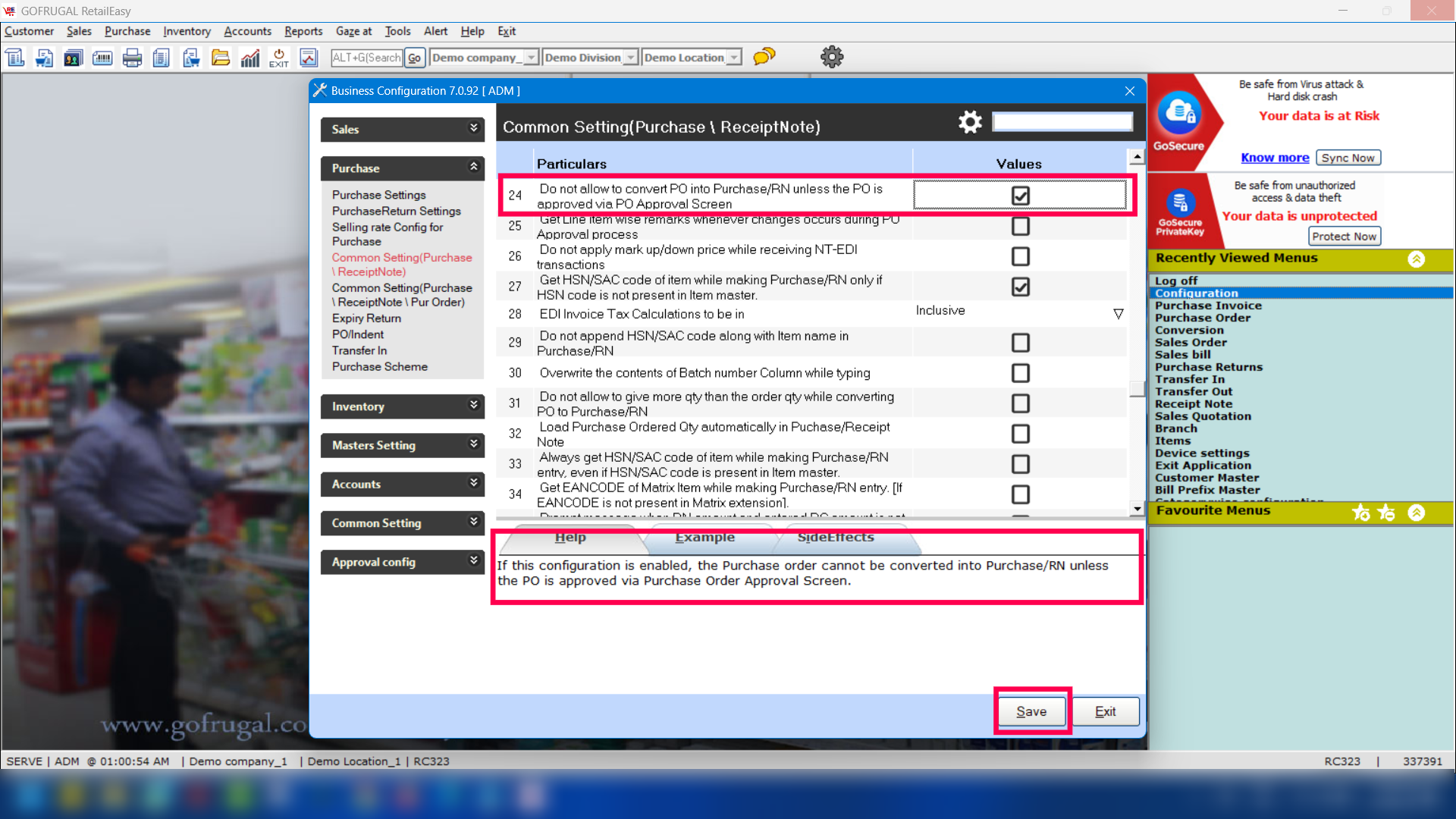 Step2: Search for "Do not allow to convert PO into Purchase/RN unless the PO is approved via Approval Screen" and pit a Tick ✔ in the Values and click on Save to save the changes.