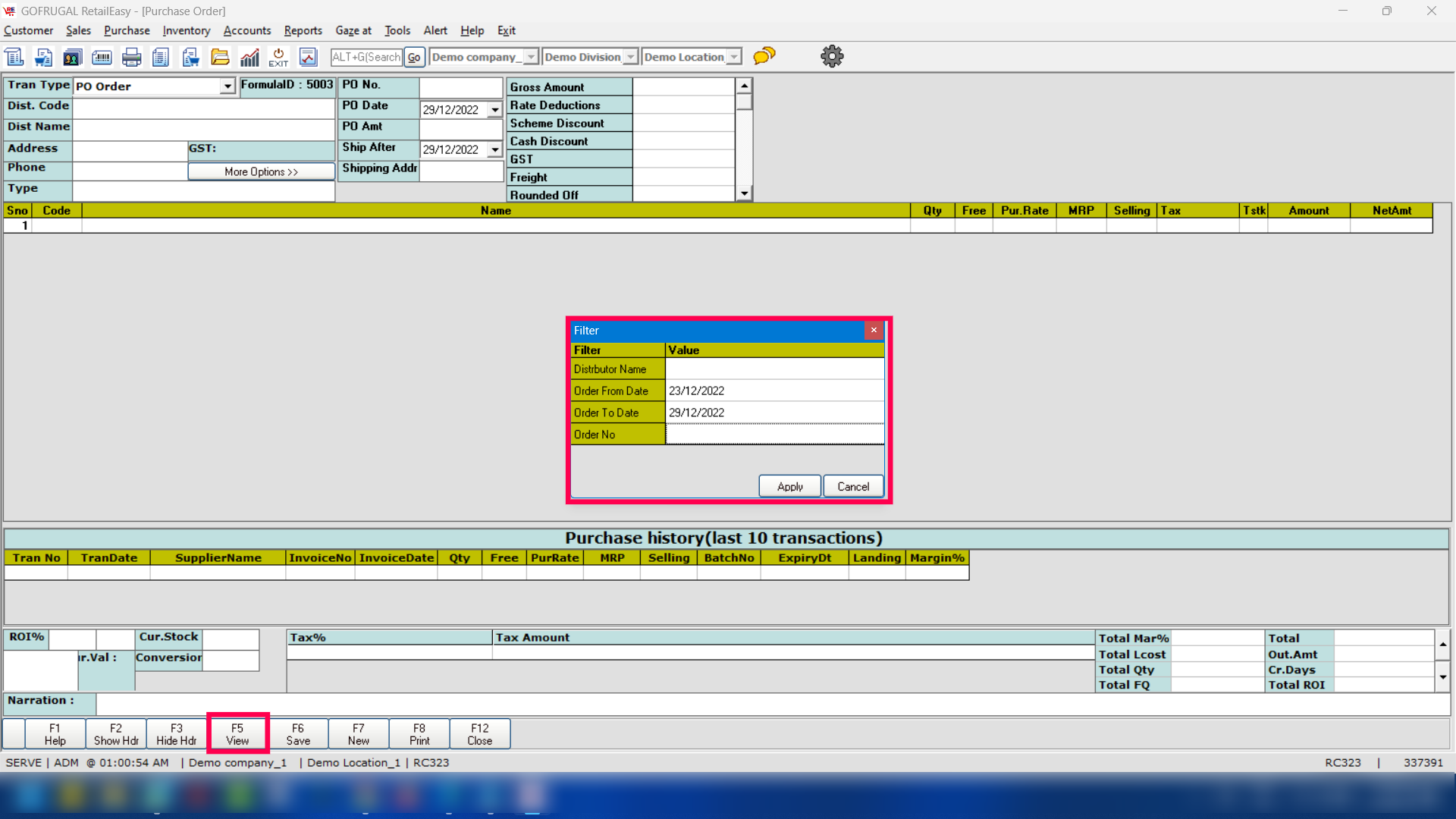 Step2: Press F5 [View] button and the Filter Box will come. Chose your desired date and in Order From Date and Order To Date and press Enter Button in the Order No field.